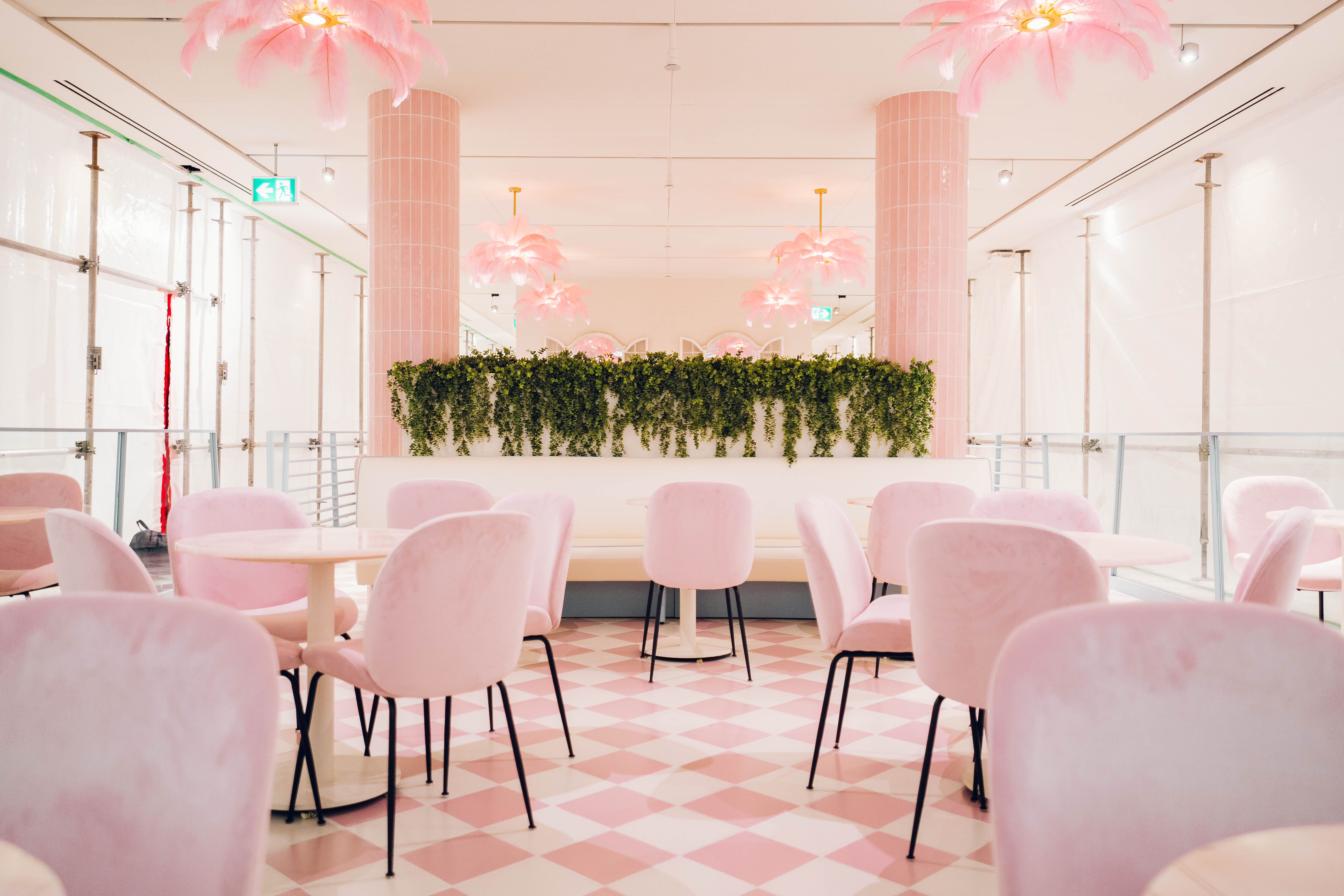 The space is instantly recognizable for its coherent use of blush and pastel pink hues spanning across every surface, from plush velvet-upholstered chairs to delicately marbled round tabletops and geometric checkered flooring. Freestanding tables are paired with arched chairs that feature slender black legs, offering visual lightness and a subtle retro nod. Pillars and partial walls clad in glazed pink tile reinforce the color story and provide gentle zoning within the open plan, while lush hanging greenery introduces a fresh accent against the otherwise continuous pink backdrop. Lofty ceilings accommodate sculptural feathered pendant lights, their exaggerated forms and rosy glow reinforcing the playful, almost fantastical ambiance. Large windows and glass barriers maximize daylight, visually expanding the already airy space and ensuring the intense pink palette feels light and uplifting rather than overwhelming.