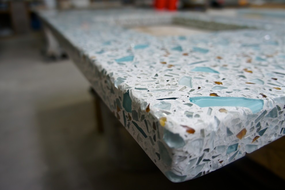 Next we have recycled glass countertops. This is a material that has been appearing in more homes these past few years. As the name states it uses recycled glass in its material composition. The most expensive recycled glass materials cost up to $160/square foot. This results in a few pros and cons.