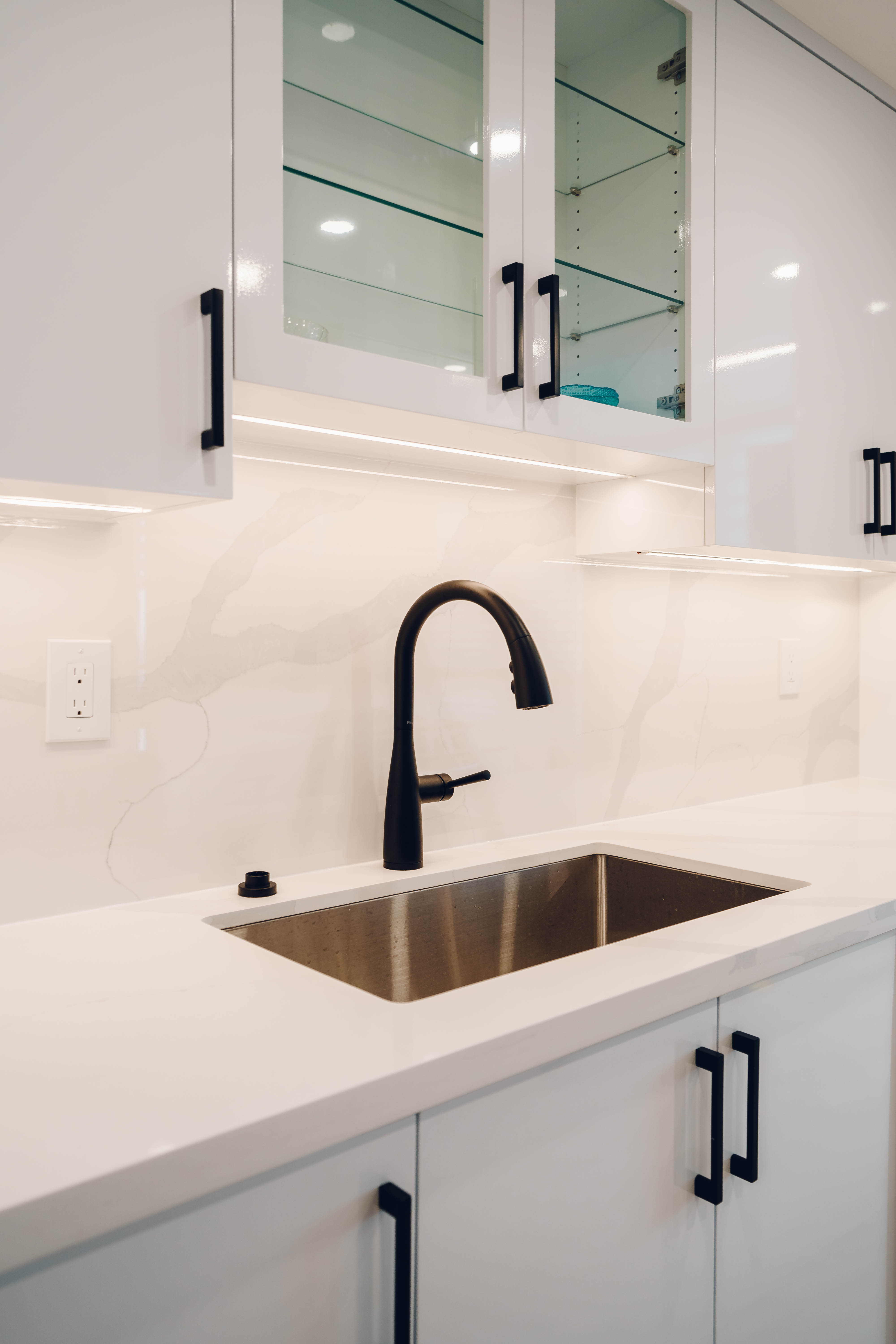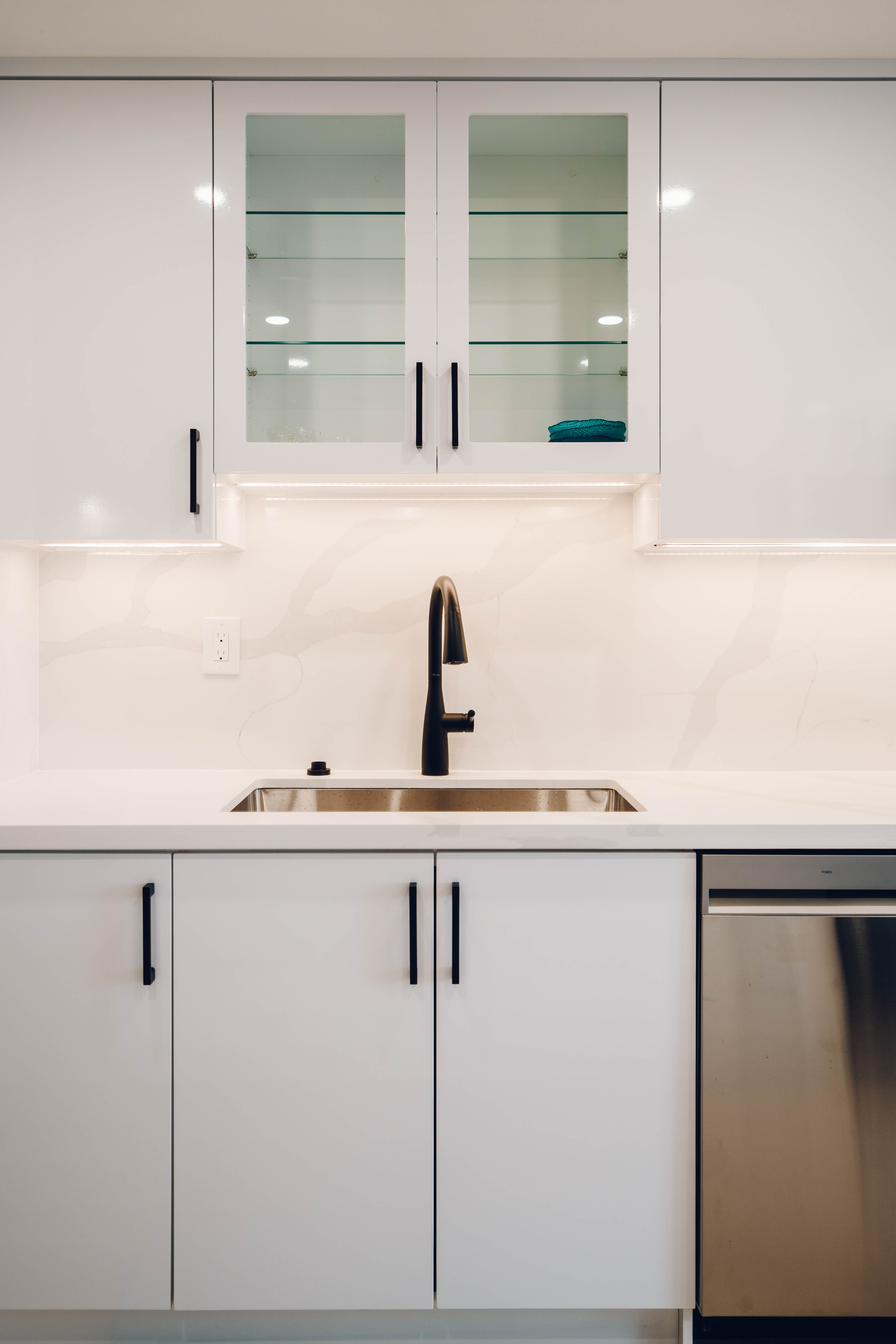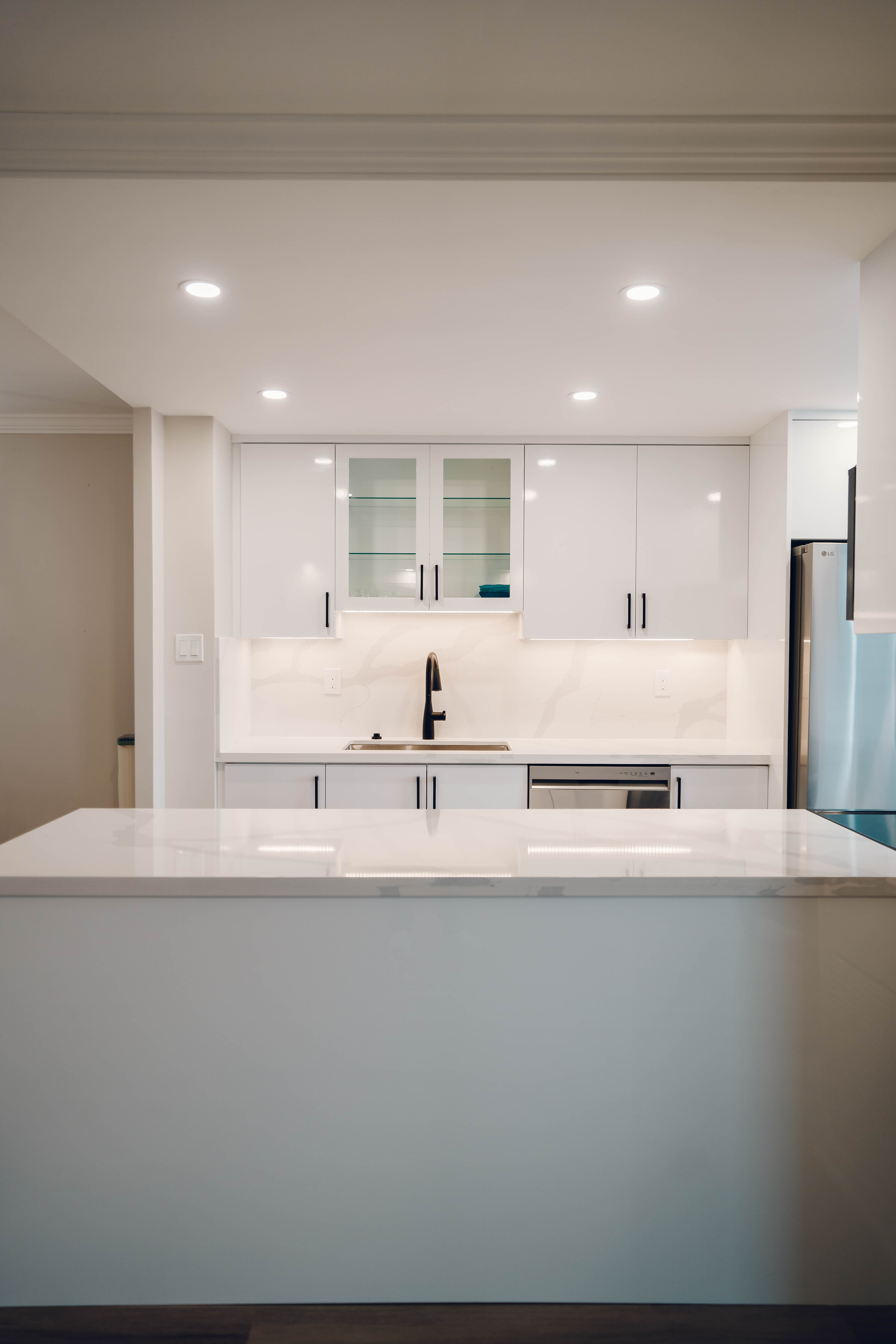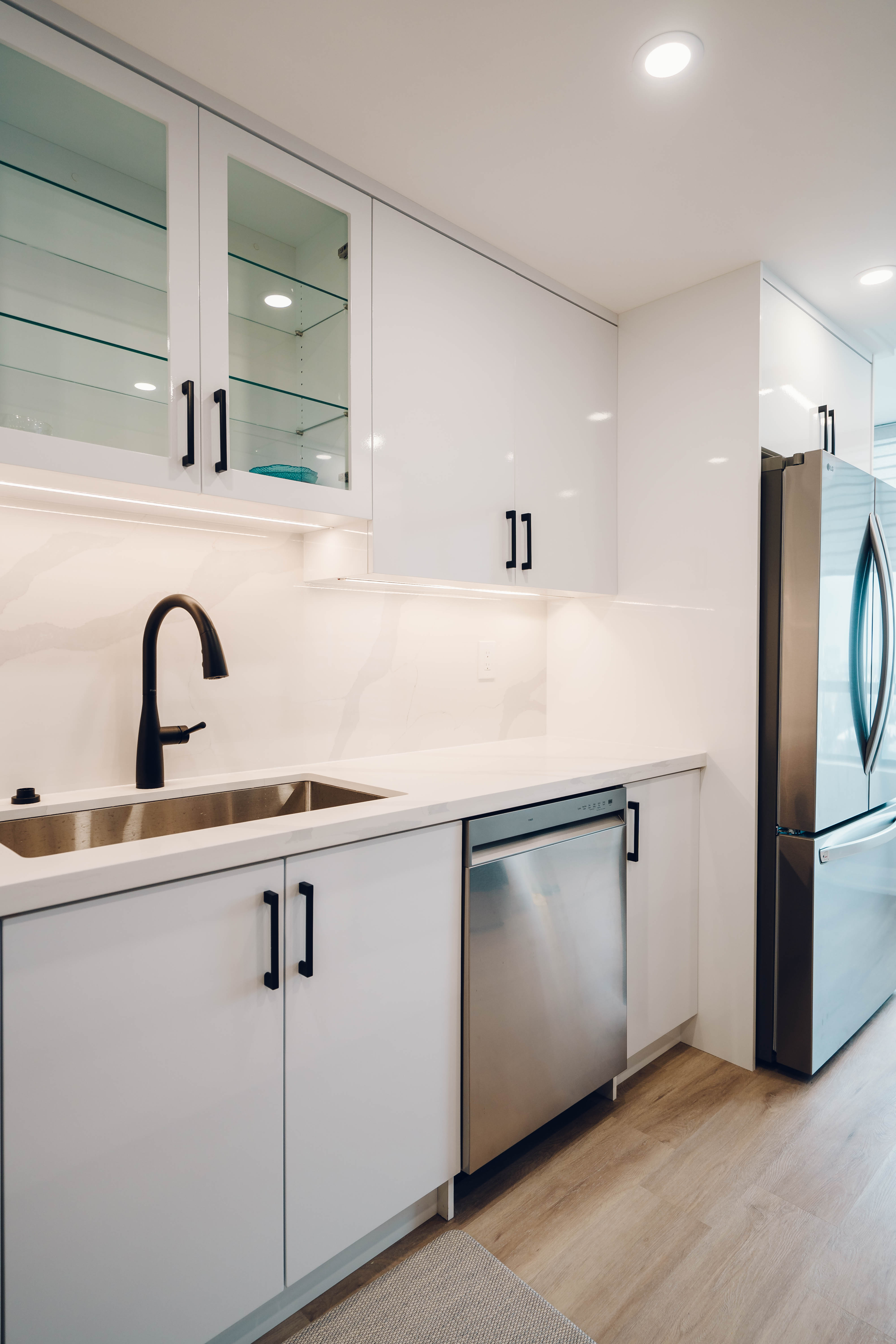 This kitchen’s modern redesign makes a statement with glossy white surfaces, minimalist hardware, and subtle natural textures for a bright, high-contrast, and contemporary ambiance.