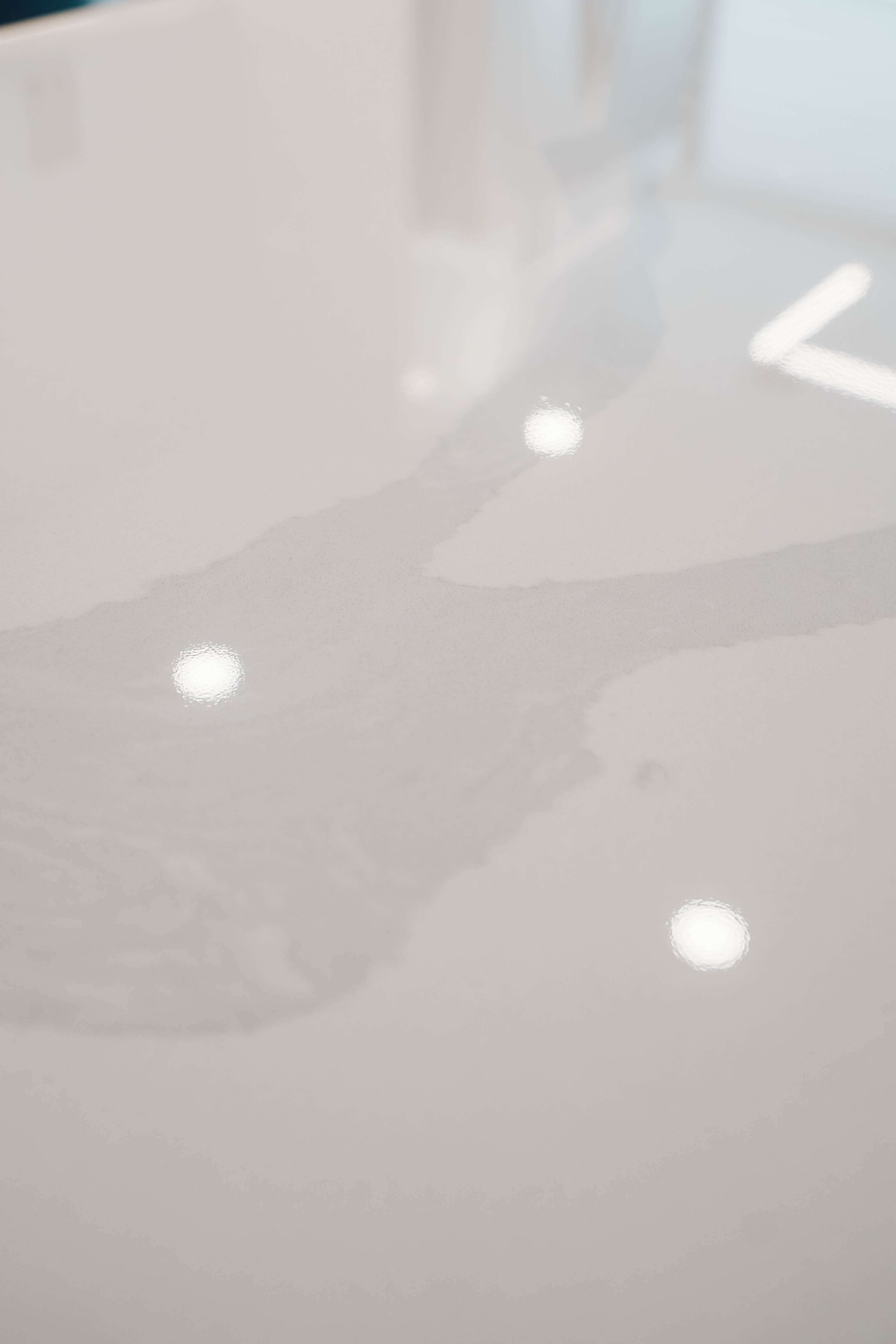 Recessed ceiling LEDs offer bright, even general illumination, augmented by sleek under-cabinet lighting to enhance tasks and highlight the backsplash’s veining. Natural light enters from the adjoining space, further lifted by the kitchen’s reflective finishes, ensuring a luminous atmosphere at all times of day.