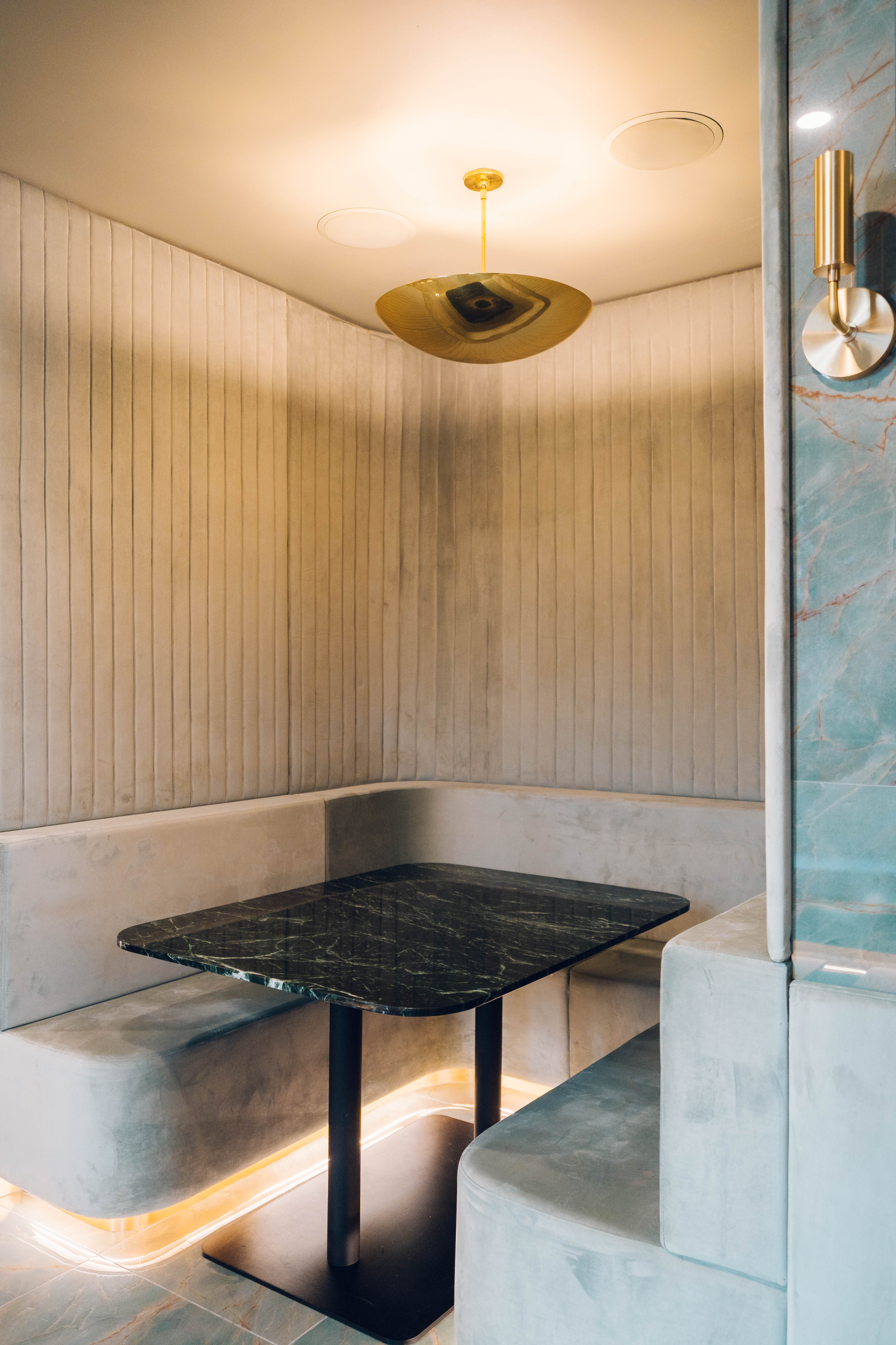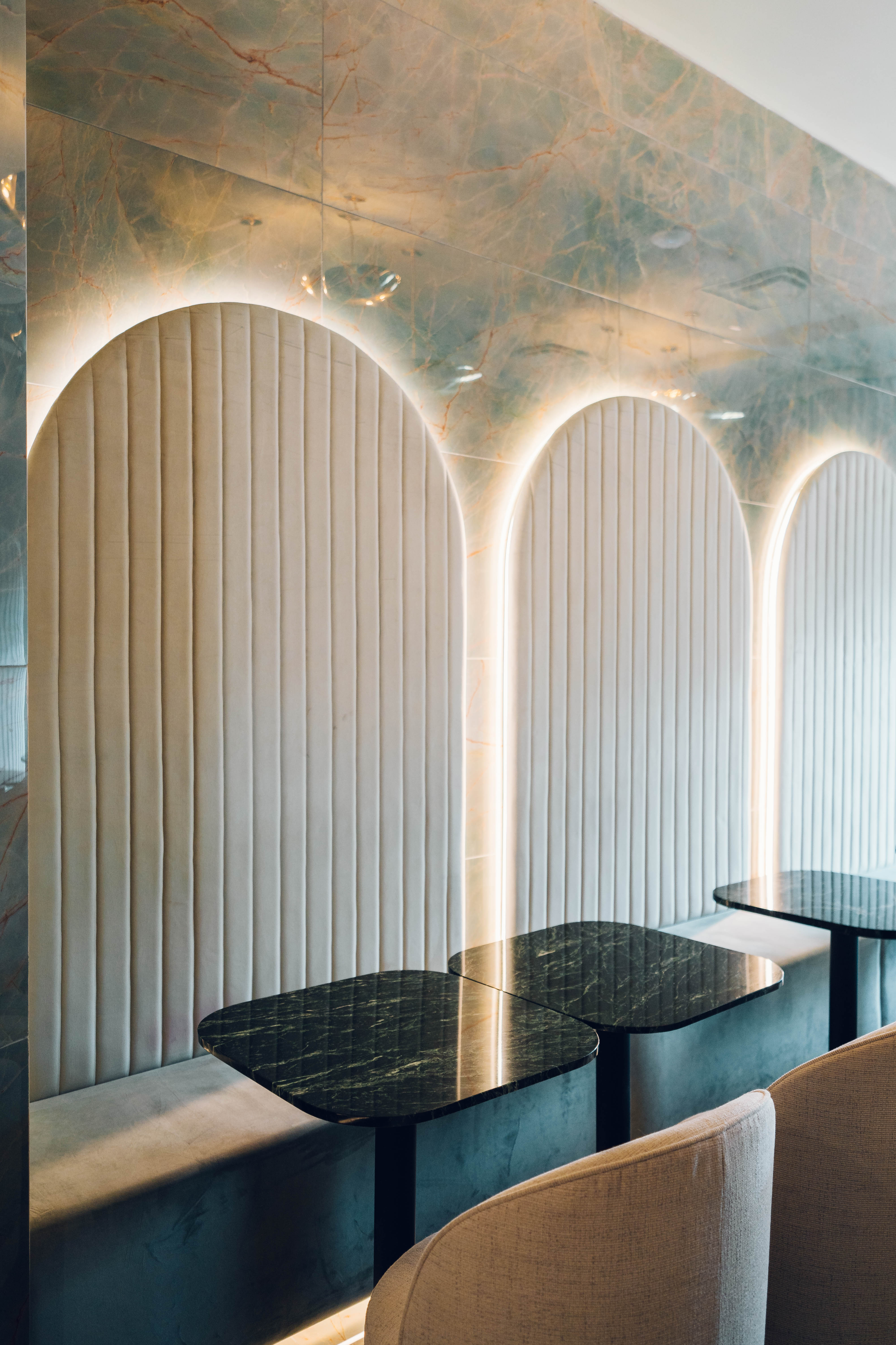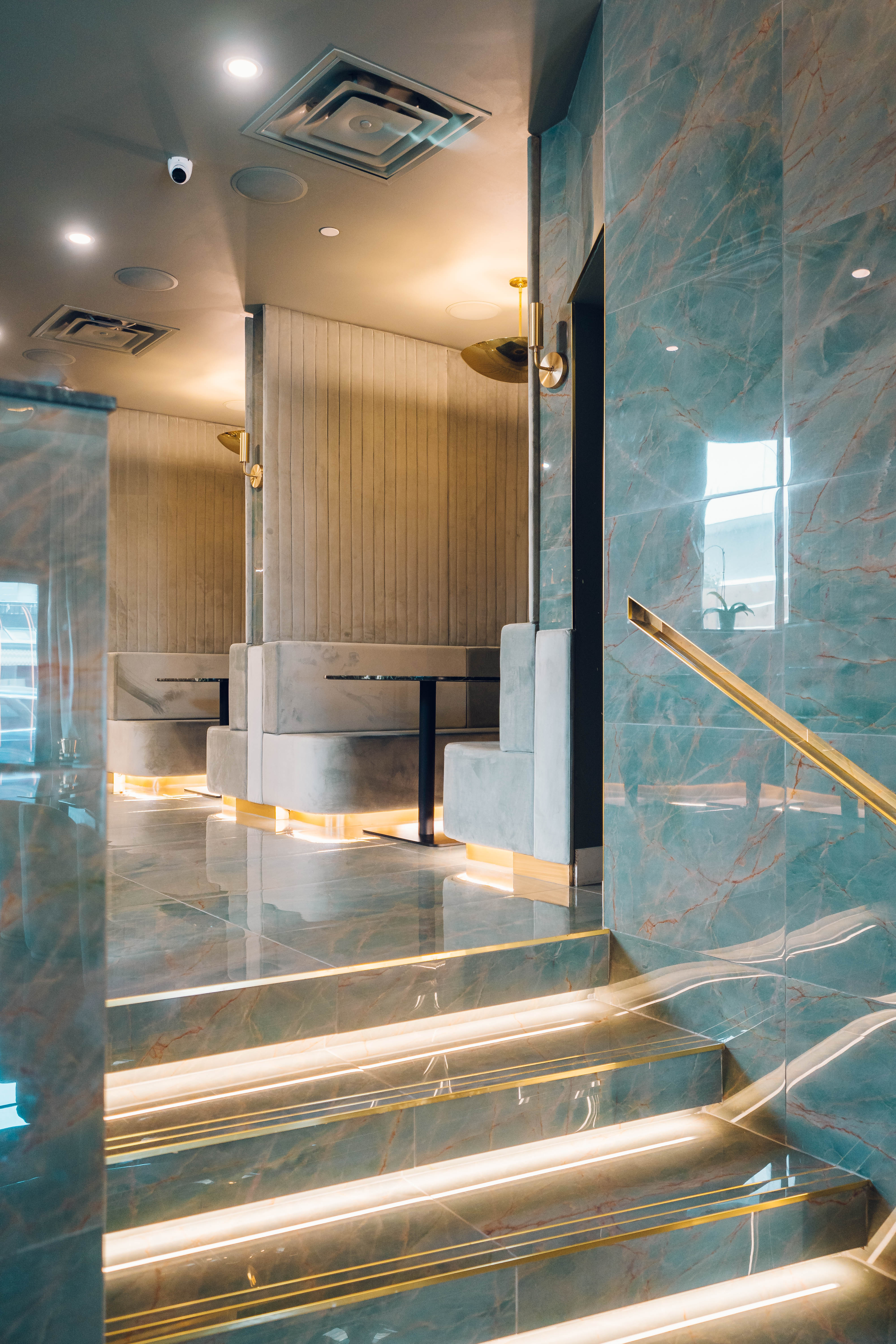 The restaurant’s design is defined by sweeping expanses of blue-green quartzite surfaces that envelop floors, walls, and stairs, lending the space a cool, cohesive visual language with both opulence and tranquility. The tables are topped with deep green, marble-look quartz featuring prominent white veining, set against integrated plush banquette seating upholstered in a soft, pale velvet for comfort and luxury. Architectural wall panels with arched forms—backlit for a dramatic effect—add depth and rhythm along the main dining area, while golden accents are introduced through minimal yet striking brass fixtures, signage, and railings. The entryway is marked by a dramatic floral installation, and throughout, reflections from glossy finishes amplify natural and artificial light, heightening the sense of spaciousness and contemporary sophistication.