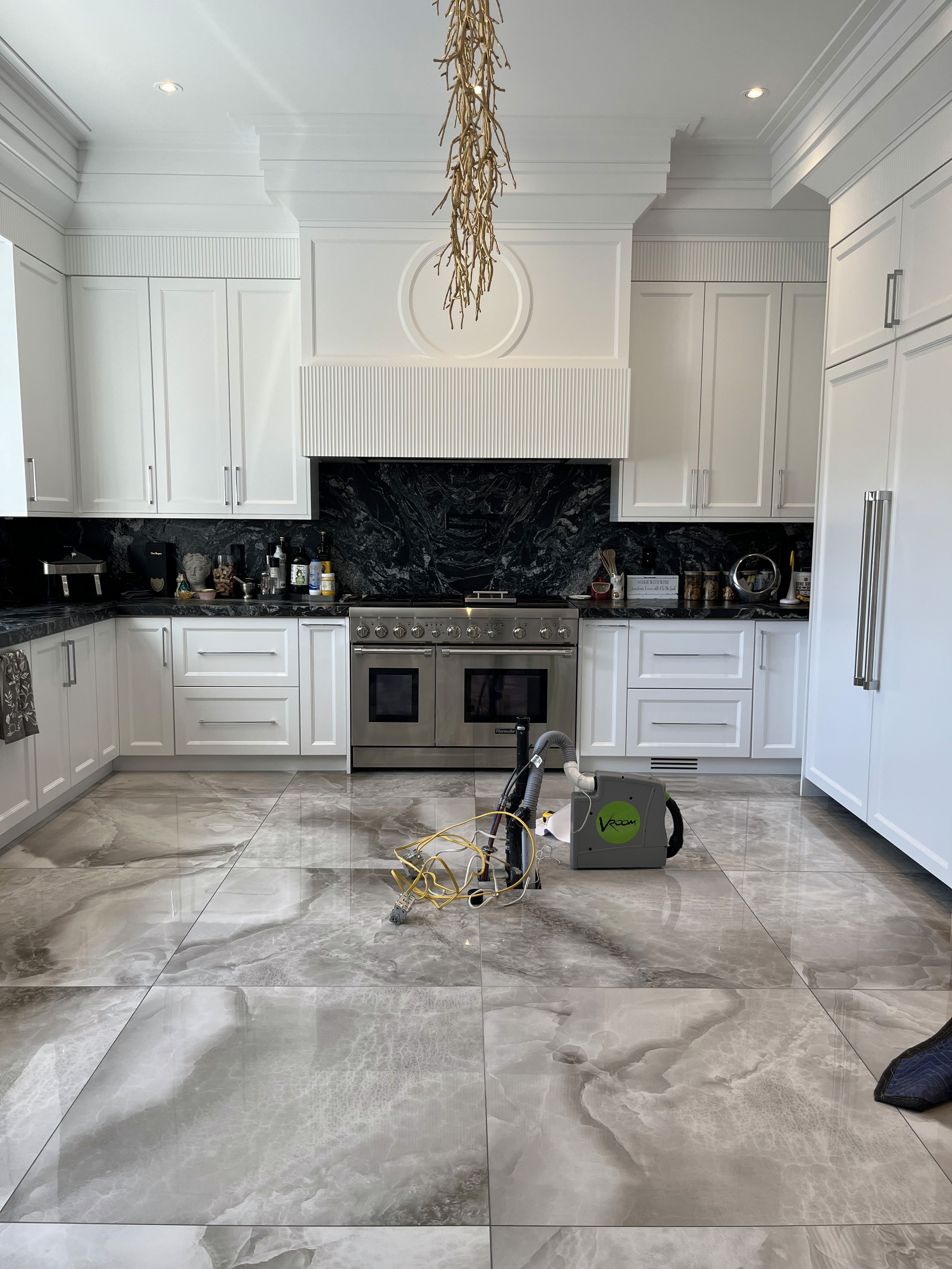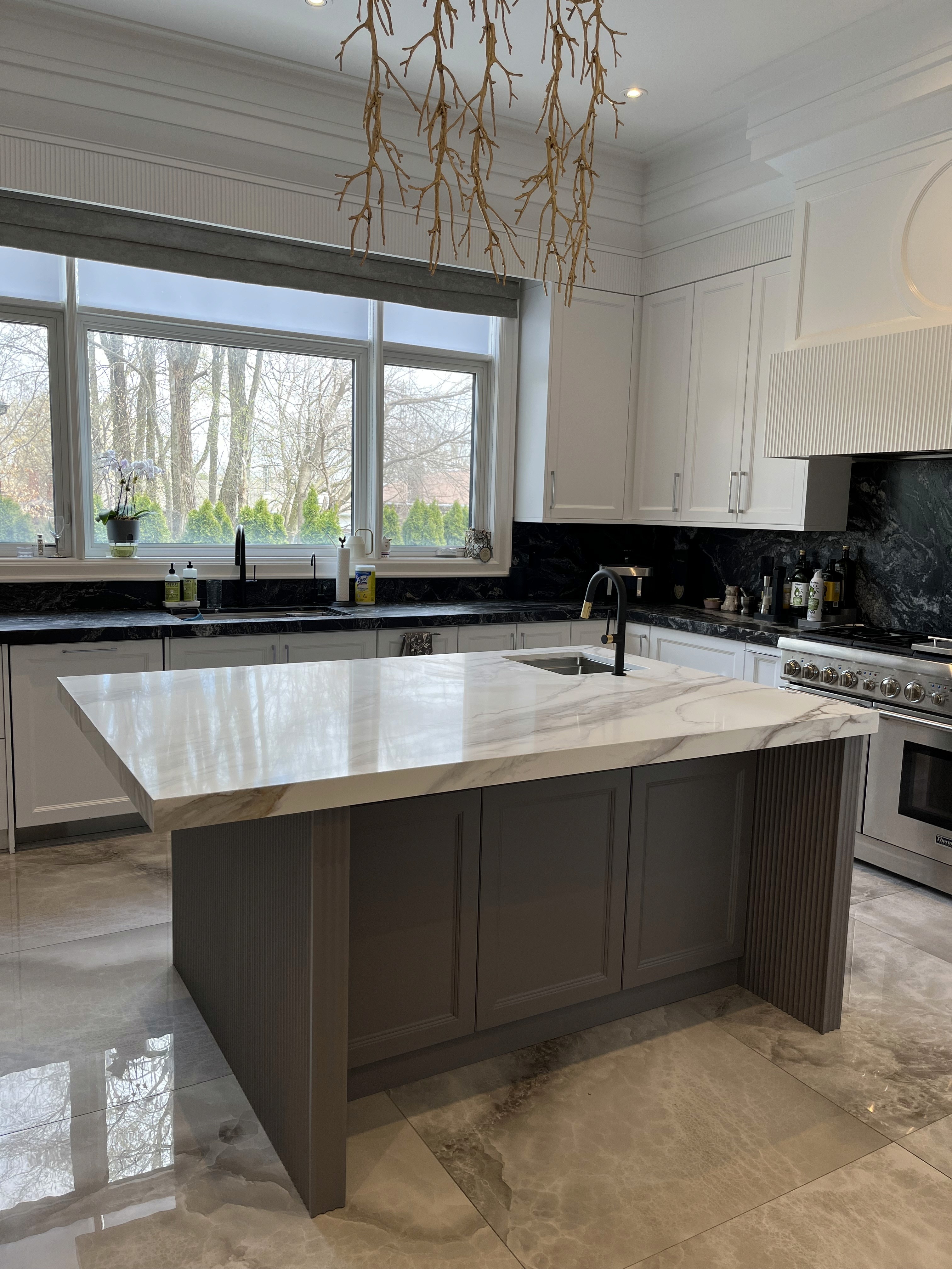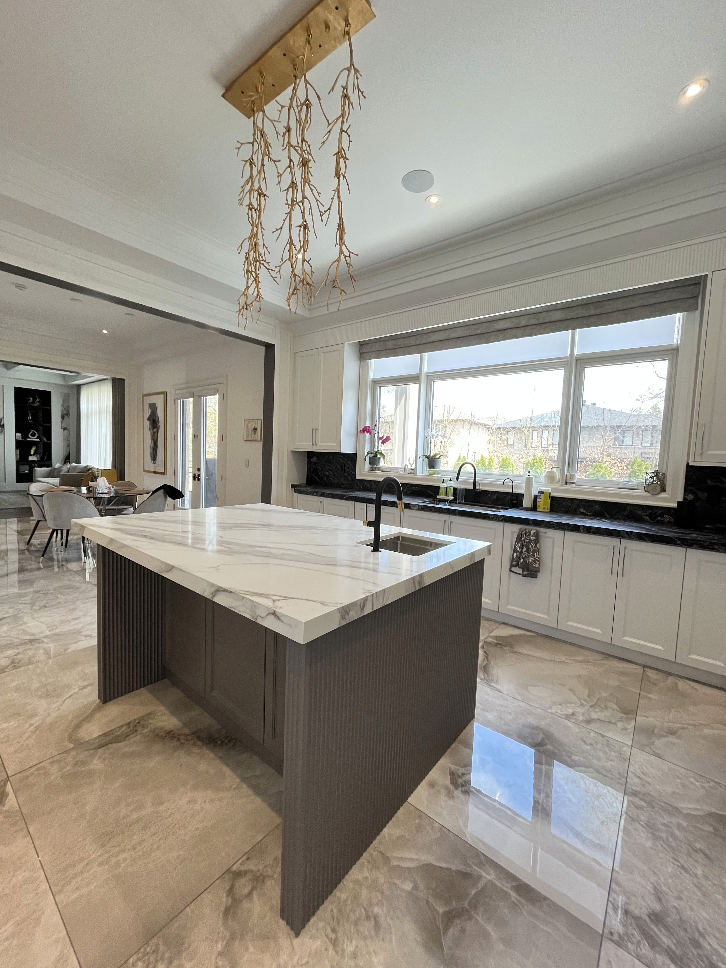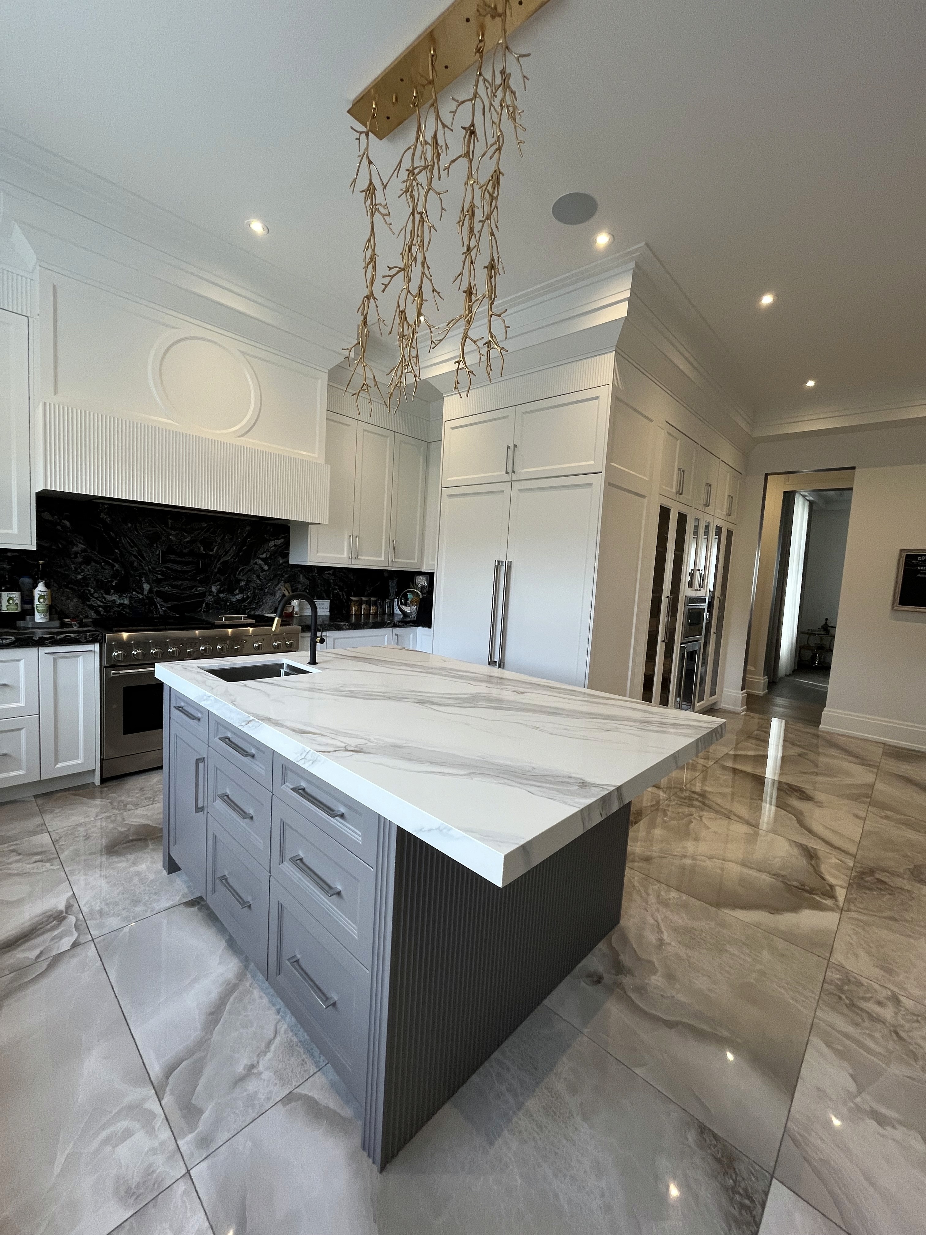 The space features an open-plan kitchen defined by crisp white cabinetry along the perimeter, with clean shaker fronts that contribute a timeless touch. The centerpiece is a sizeable island with fluted gray paneling and deep drawers, topped by a dramatic waterfall-effect marble countertop boasting expressive gray veining. The surrounding countertops and backsplash are rendered in a rich, swirling black stone, establishing a strong contrast against the cabinetry and creating visual depth. Oversized, high-gloss porcelain floor tiles echo the hues of the counters and island, seamlessly continuing the room’s sophisticated palette. Architectural moldings and a sculptural vent hood highlight the room’s tailored, custom feel. The ensemble is finished with a contemporary gold ceiling fixture adorned with abstract organic branches, adding artistic flair and visual interest.