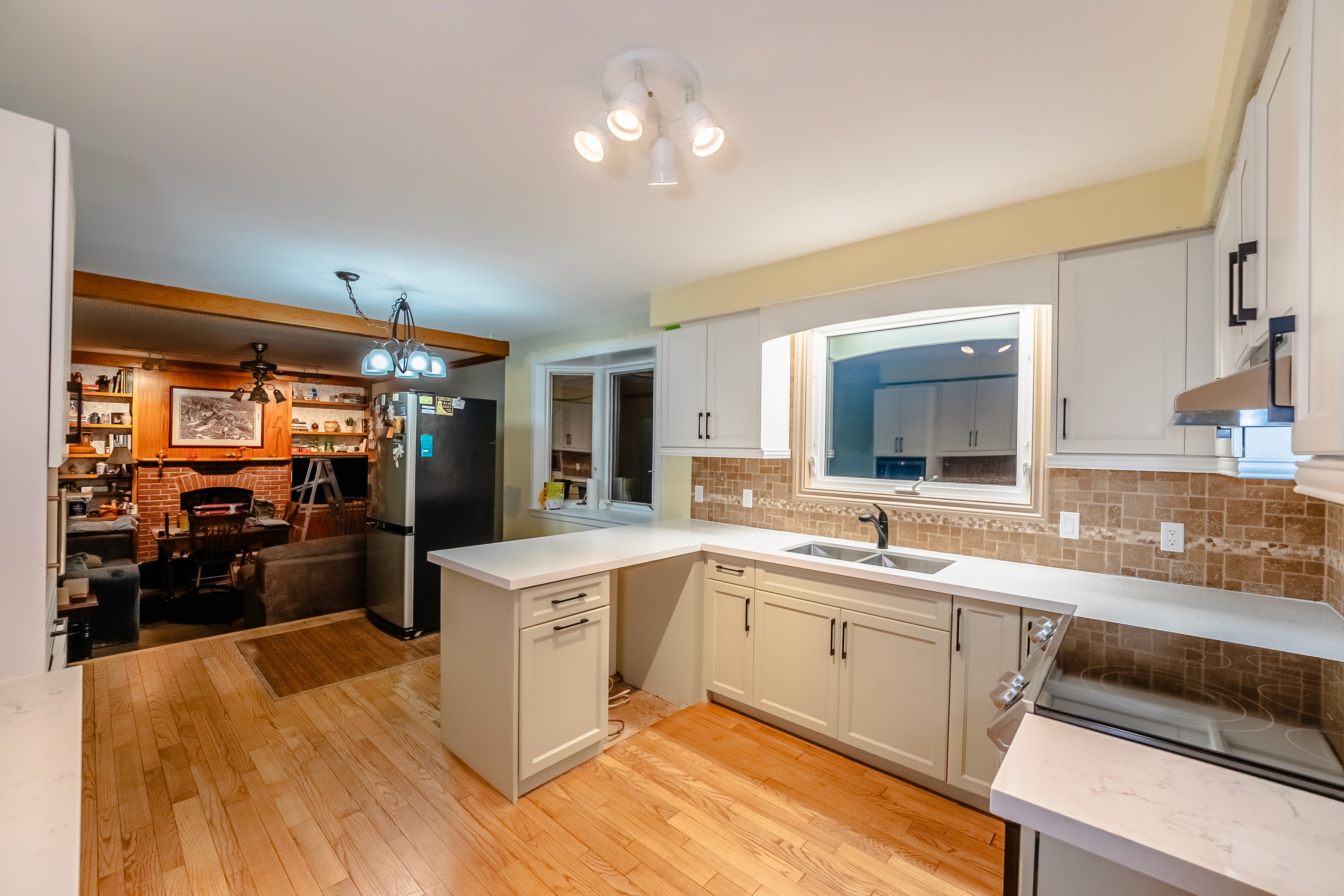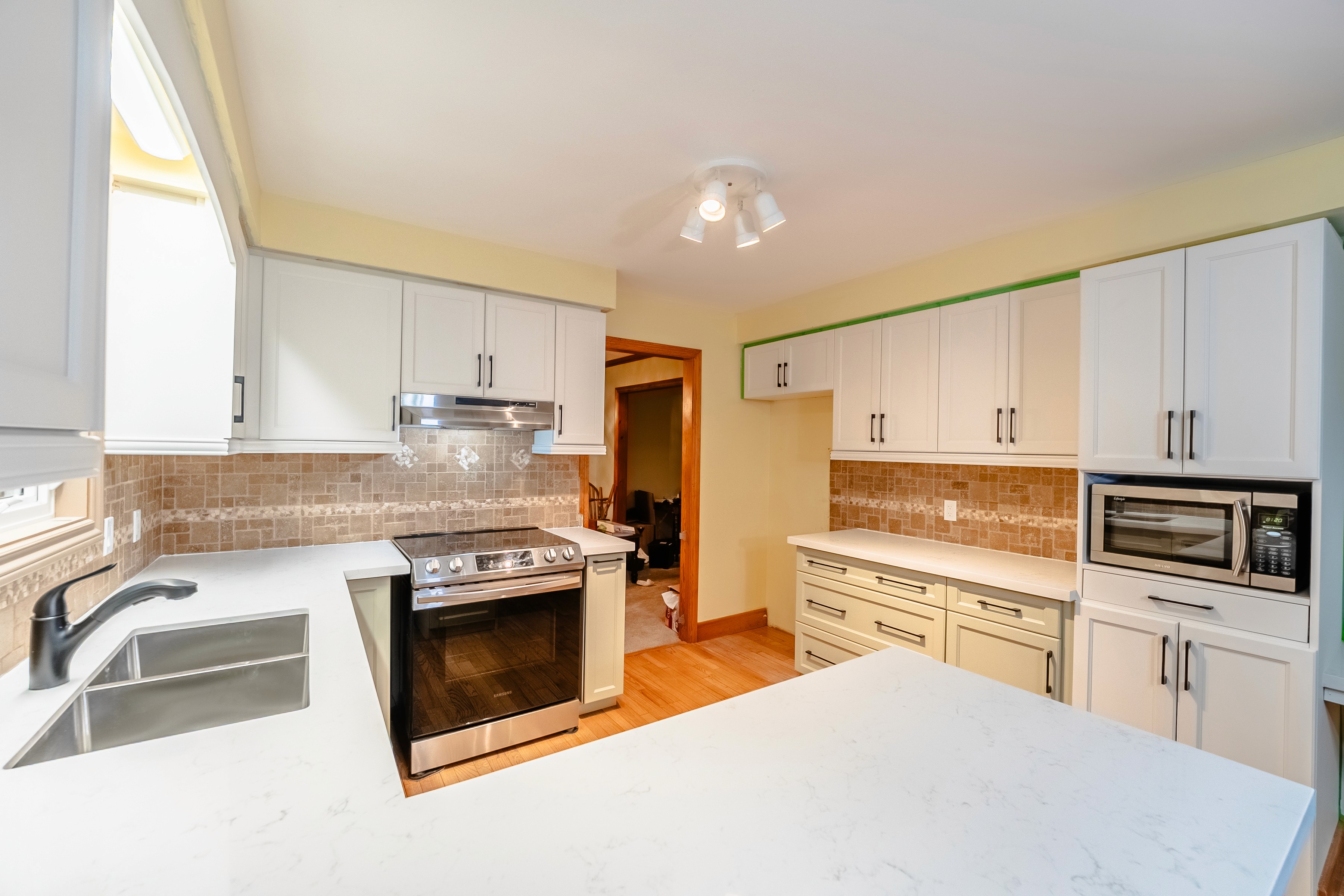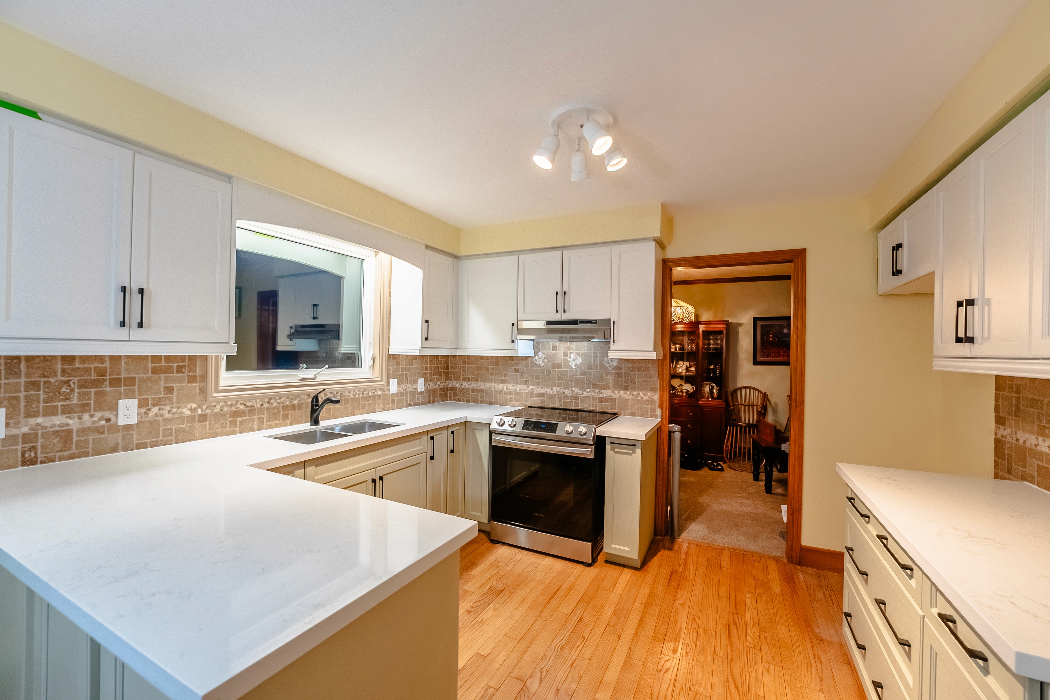 The kitchen features a U-shaped layout that maximizes work space and creates an open flow to adjacent rooms, with cabinetry that has been fully refaced for a refreshed, harmonious look. The upper cabinets are a bright, soft white, while lower cabinets present a complementary off-white or light cream, all with sleek matte black hardware that introduces a contemporary contrast. Lucent quartz countertops, with their subtle marbling, add both elegance and durability, and are paired with a tan travertine-style backsplash for a touch of rustic texture. Warm hardwood floors ground the space, while the integration of new soft-closing mechanisms demonstrates an emphasis on both quiet function and refined detail. The result is a bright, balanced kitchen that feels up-to-date but inviting, with carefully considered finishes enhancing both style and utility.