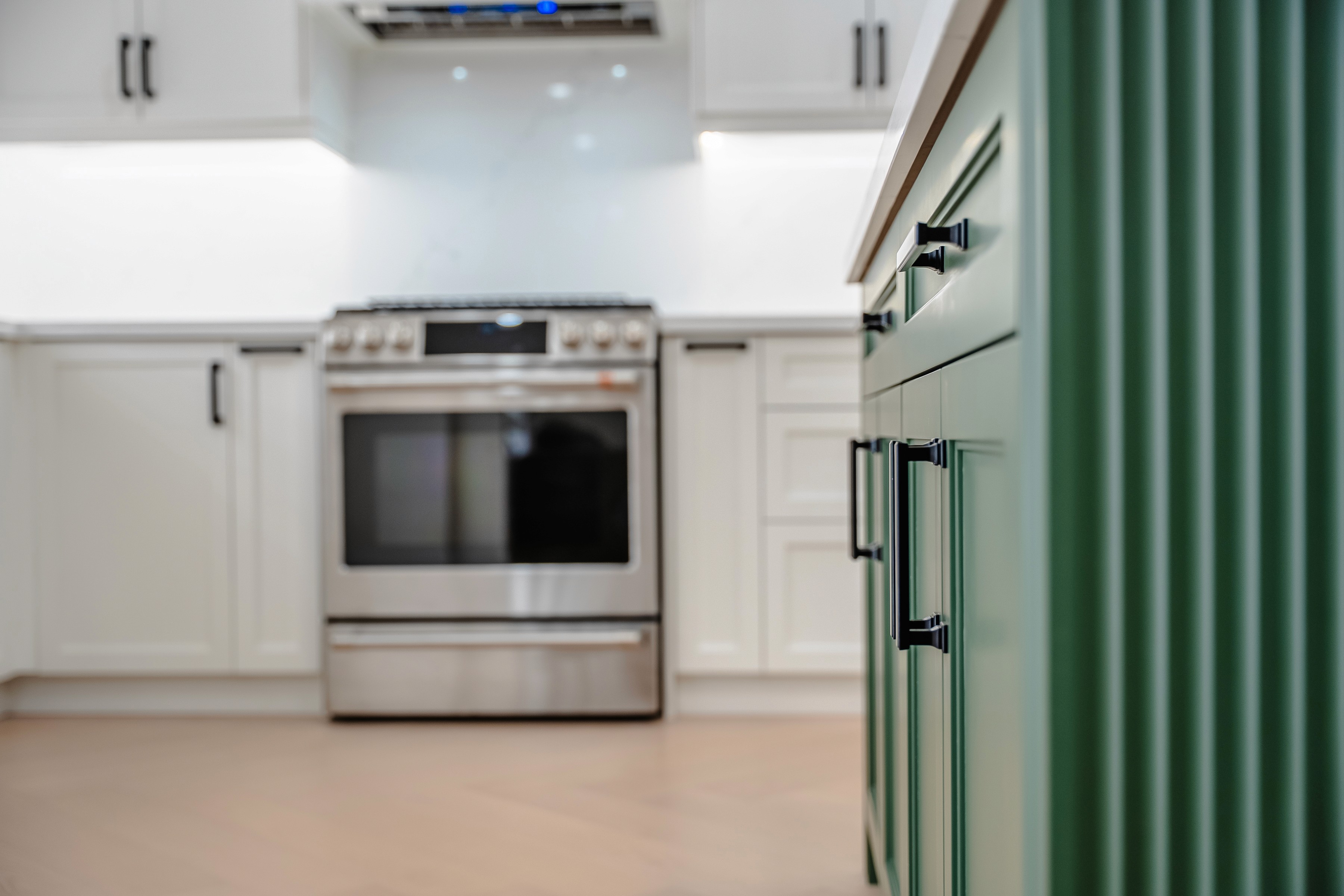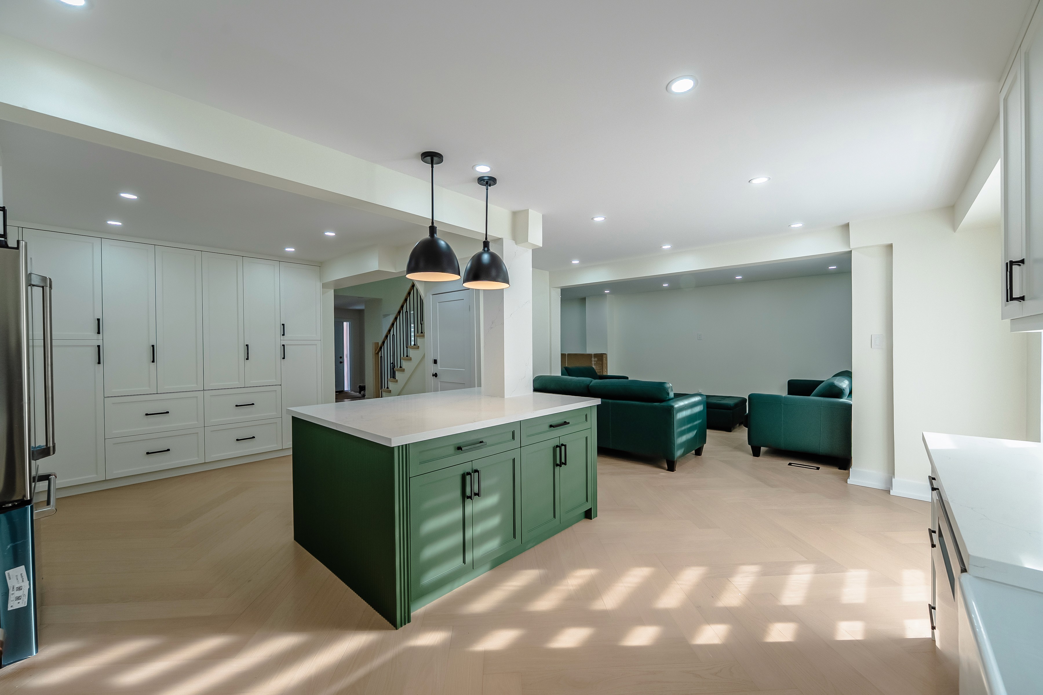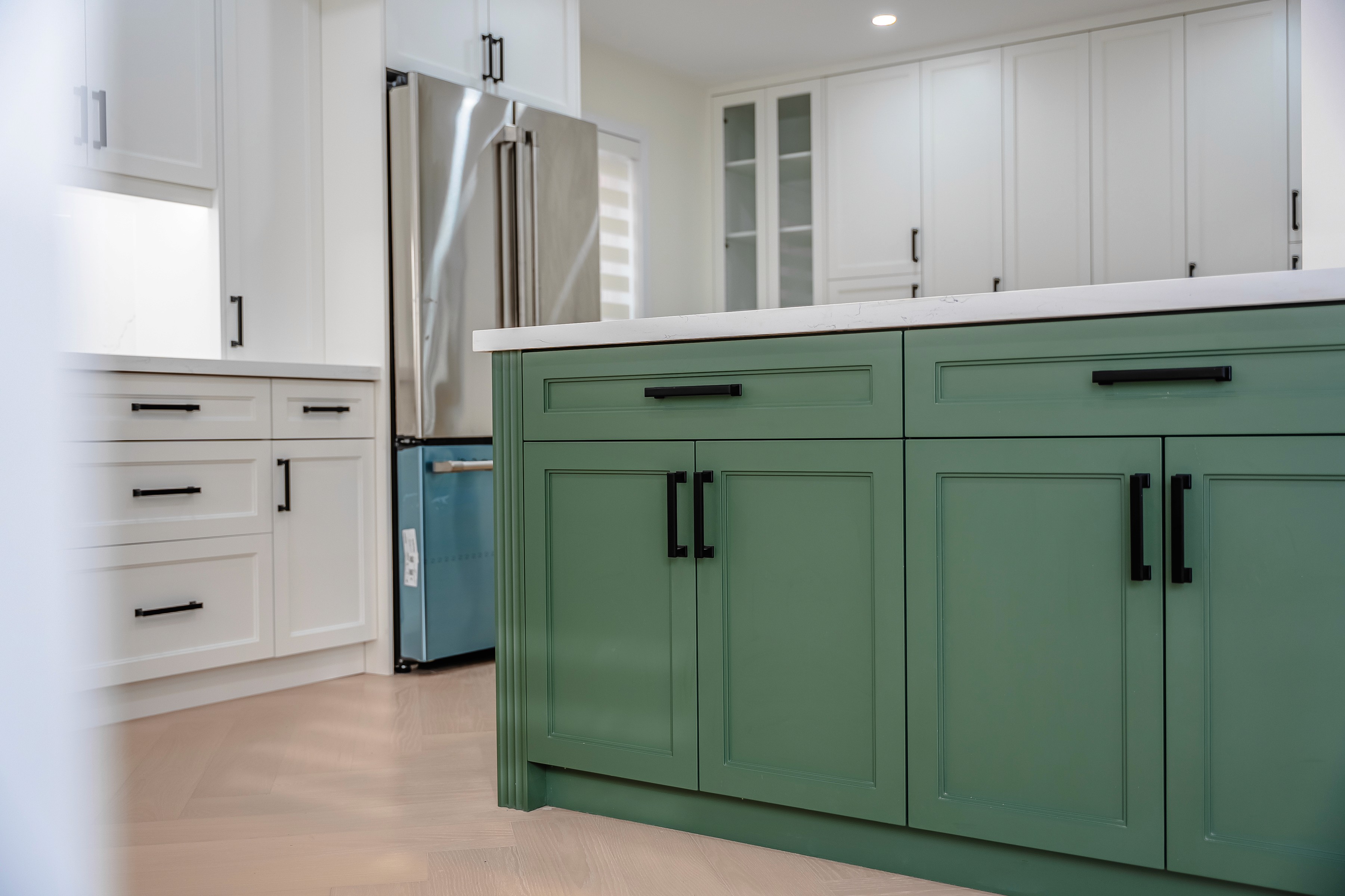 The foundational palette features crisp white cabinetry and walls, balanced by pale, natural wood flooring. Matte black accents—from hardware to pendant lighting—add definition, while the green island introduces a bold yet grounded pop of color, tying together classic and current influences.