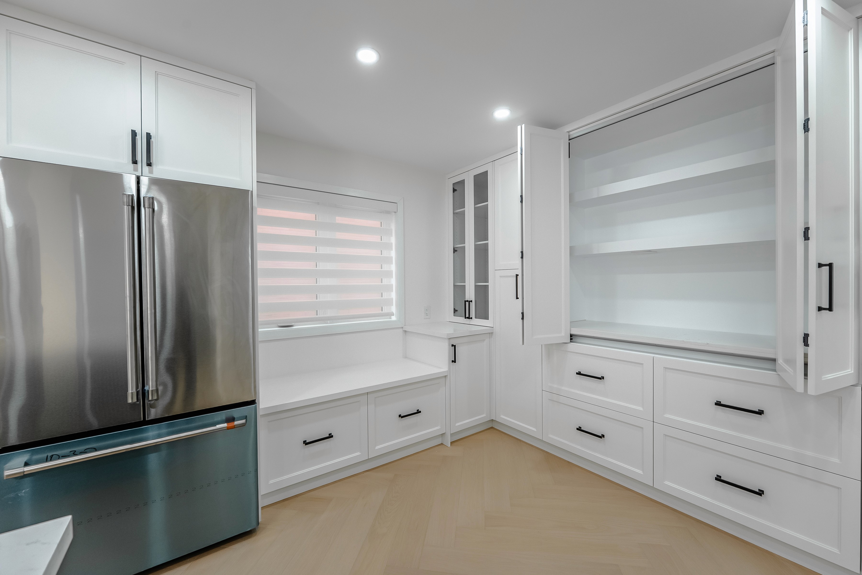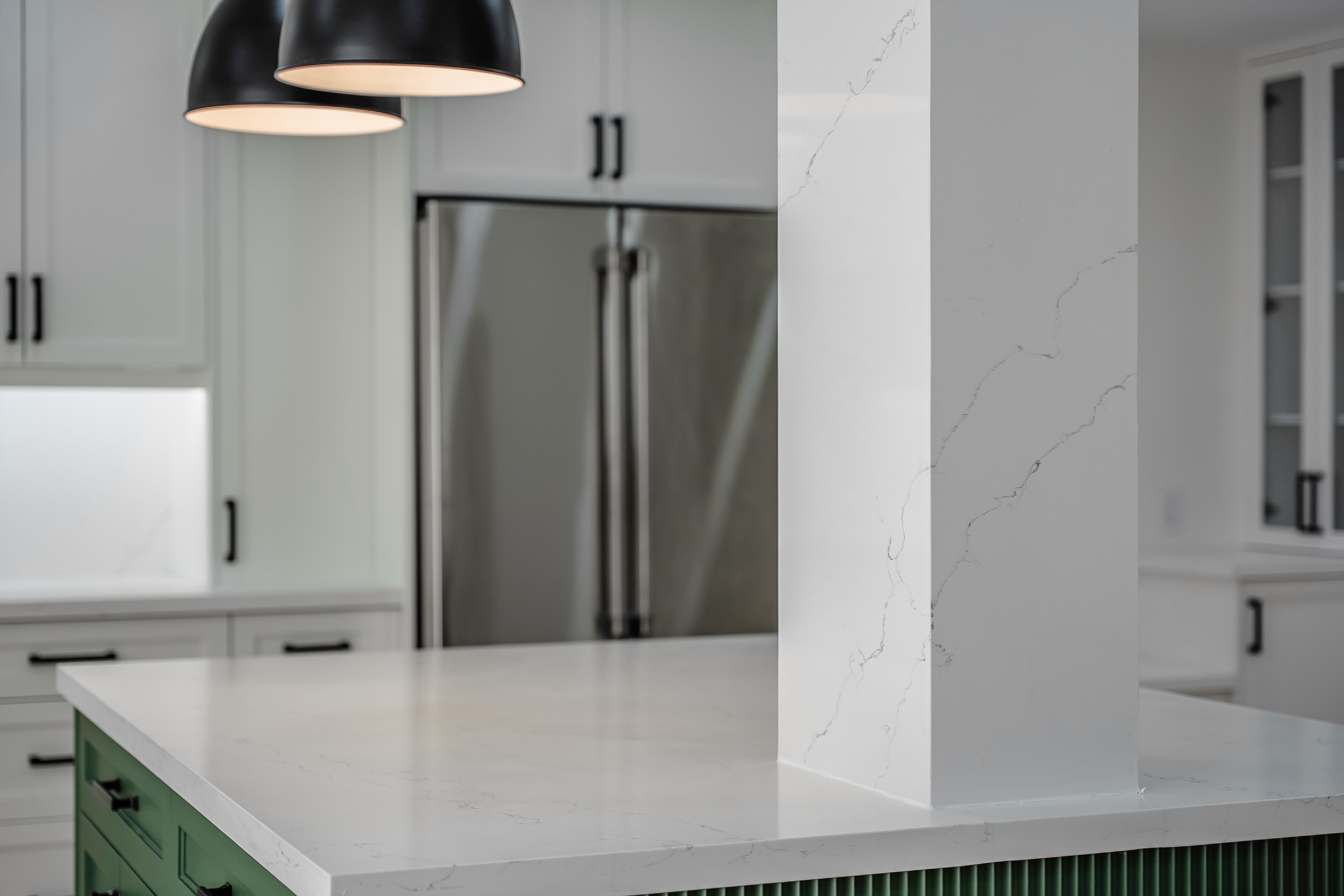 The kitchen features a U-shaped perimeter layout with extensive white shaker-style cabinetry offering both open and closed storage solutions, complemented by matte black hardware for contrast. Sleek, professional-grade stainless steel appliances—including a French door refrigerator and a gas range—integrate seamlessly within the design, while a spacious white quartz countertop provides a durable, continuous work surface. The standout feature is the central island in a rich, deep green, which acts as both a workspace and informal gathering spot, accented by a pair of oversized black pendant lights above. Subtle veining in the slab backsplash and perimeter countertops adds sophistication, while custom built-ins, such as a bench seat and floor-to-ceiling pantry, enhance functionality along the adjacent wall. The overall ambiance is fresh and inviting, combining a sense of openness with purposeful detailing.
