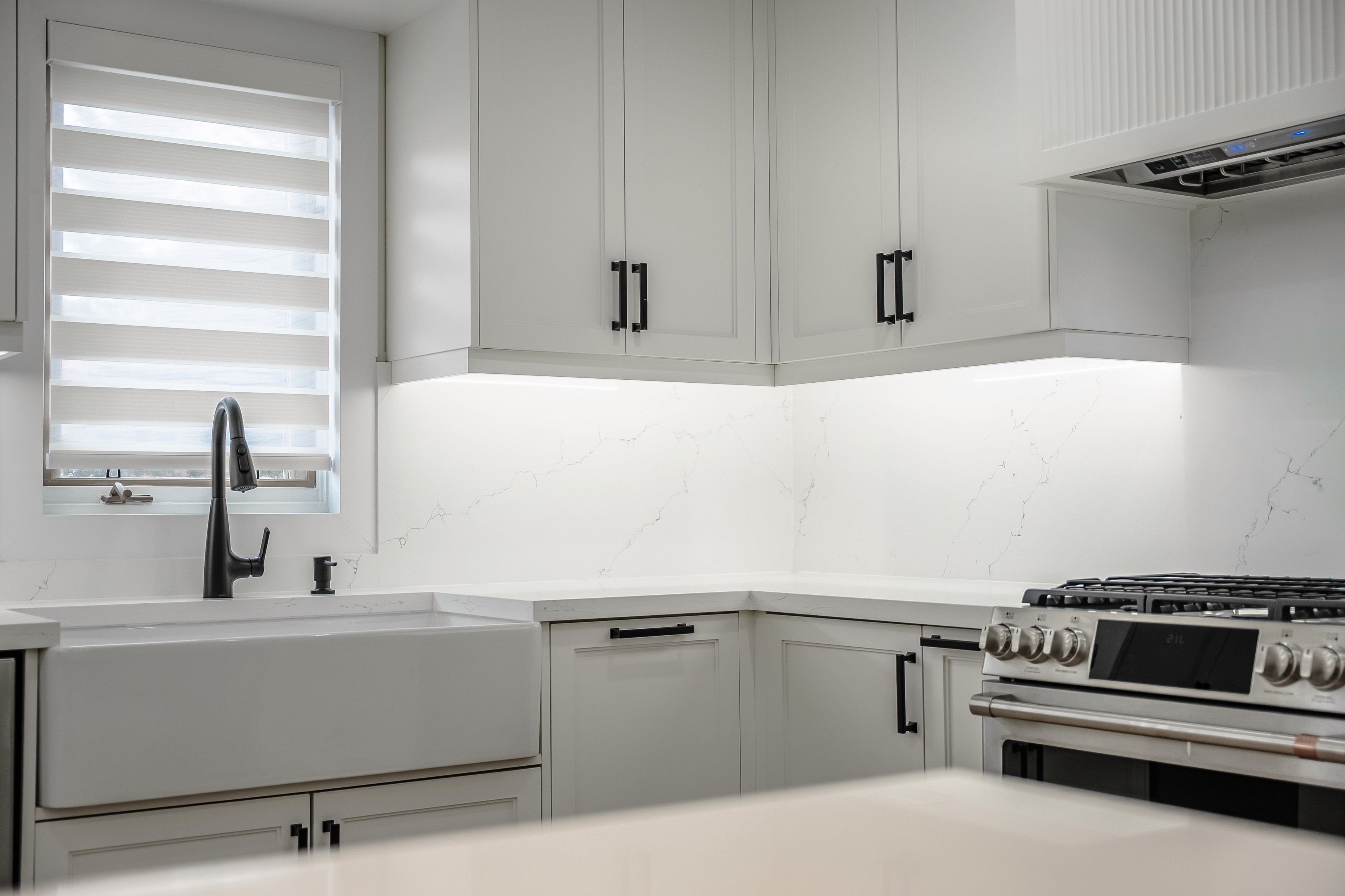 This kitchen remodel blends modern farmhouse elements with crisp, contemporary lines, creating a bright, functional space anchored by clean cabinetry and a bold, earth-toned island.