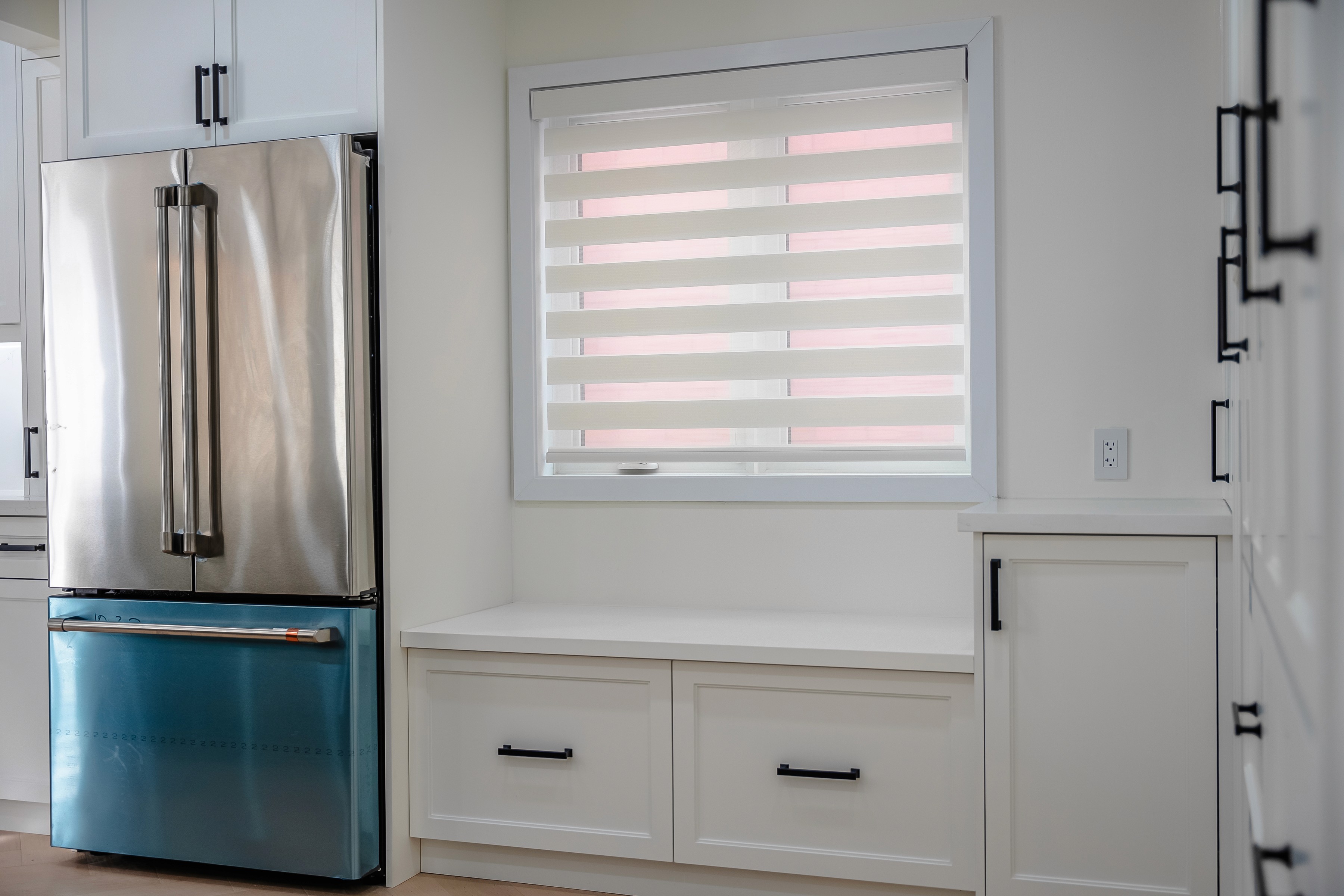 Lighting includes an even distribution of recessed ceiling lights for overall brightness, augmented by large black dome pendants above the island for focused, decorative illumination. Ample natural light is diffused through dual-layered, soft-fabric roller shades on the windows, ensuring the space feels both luminous and comfortable throughout the day.