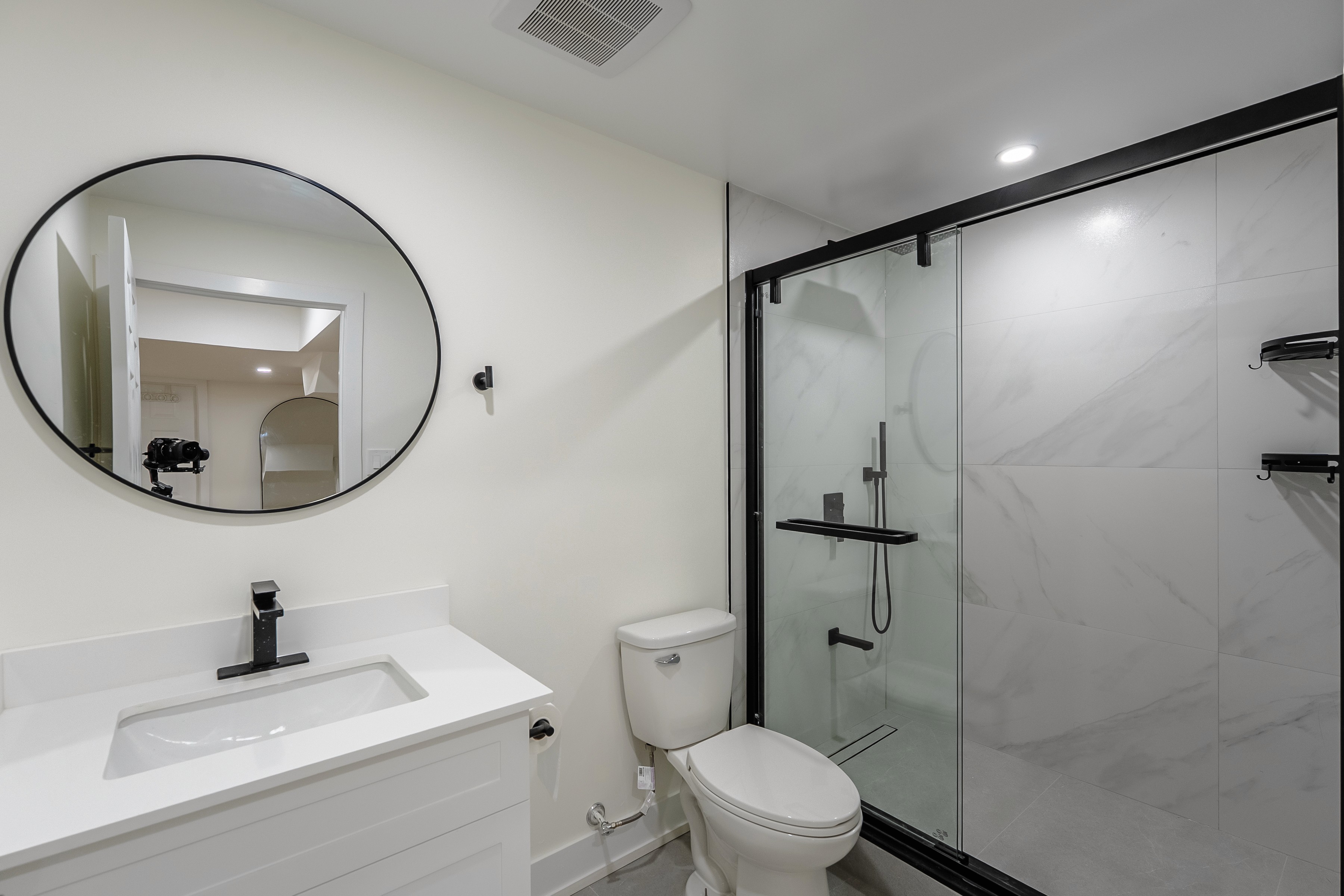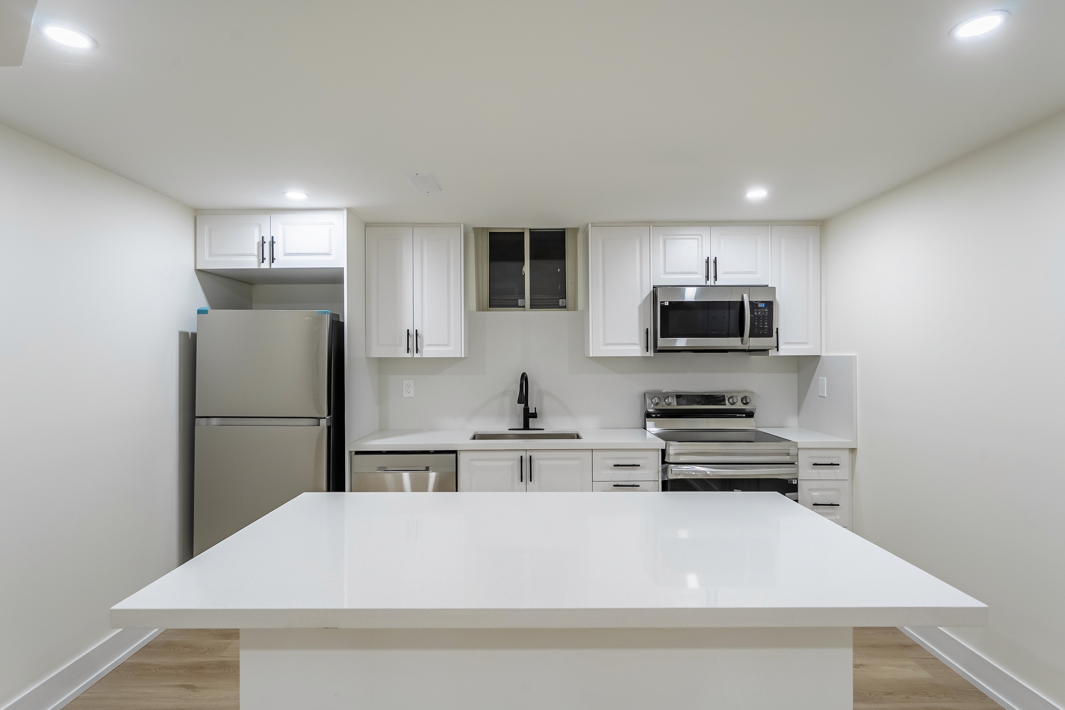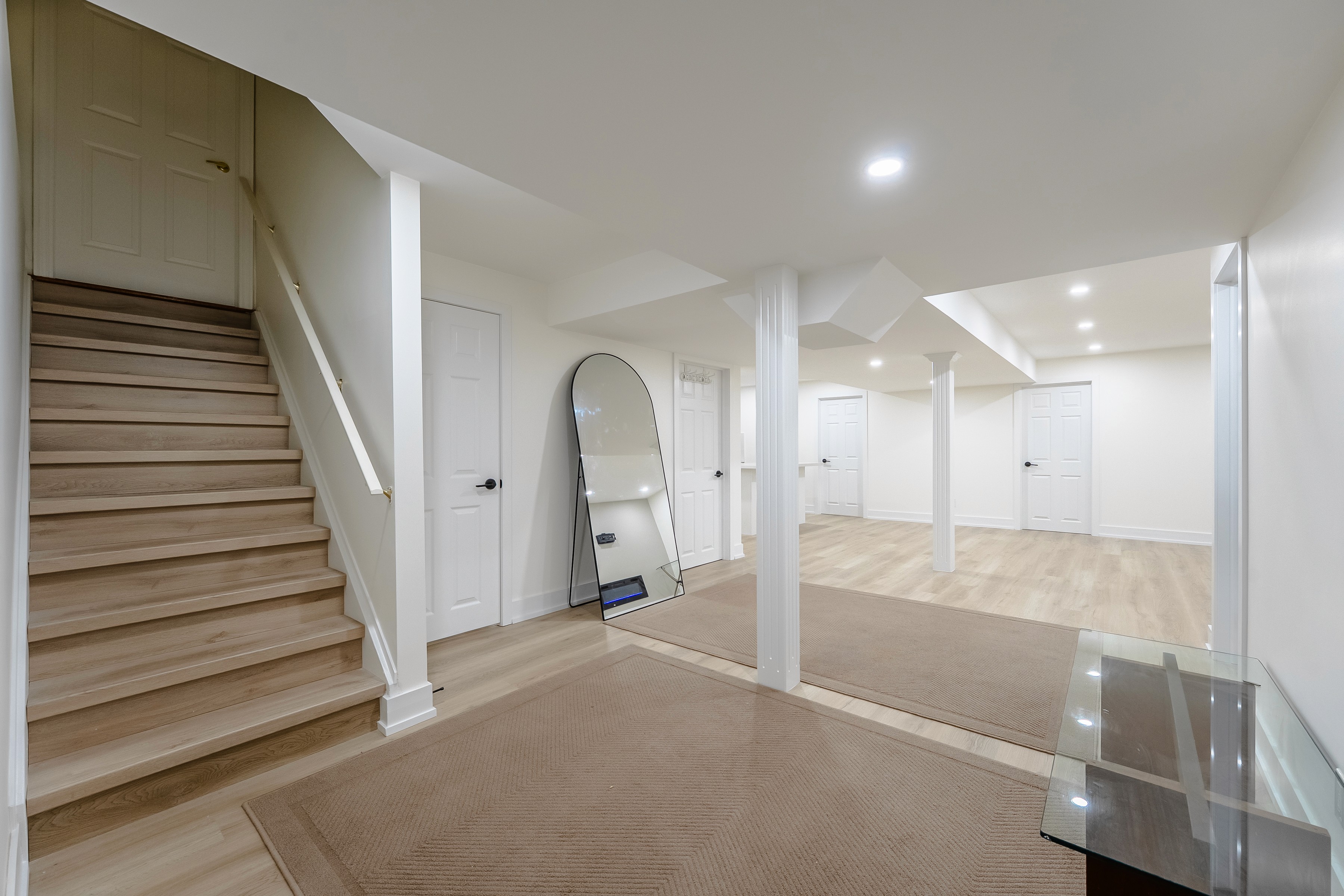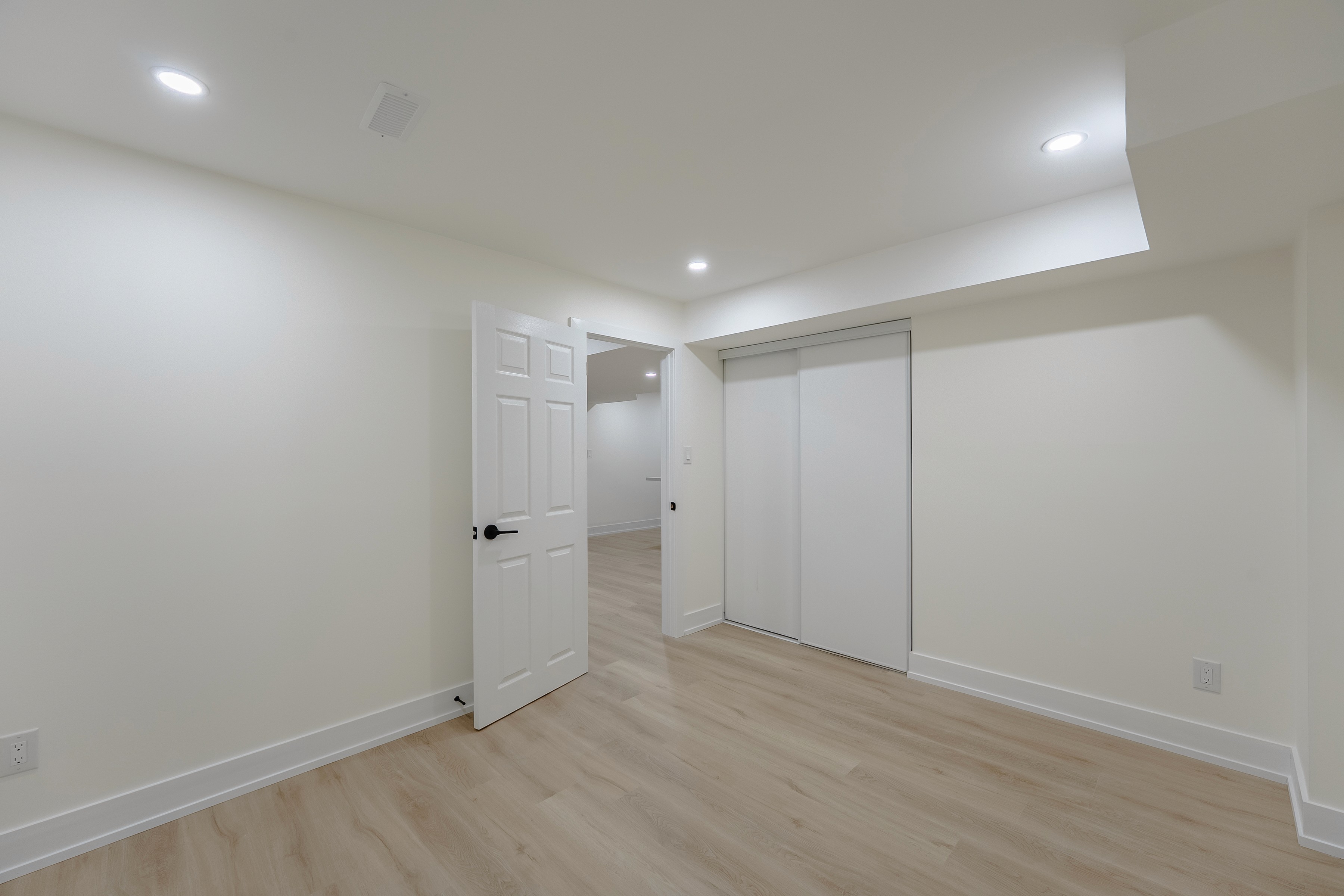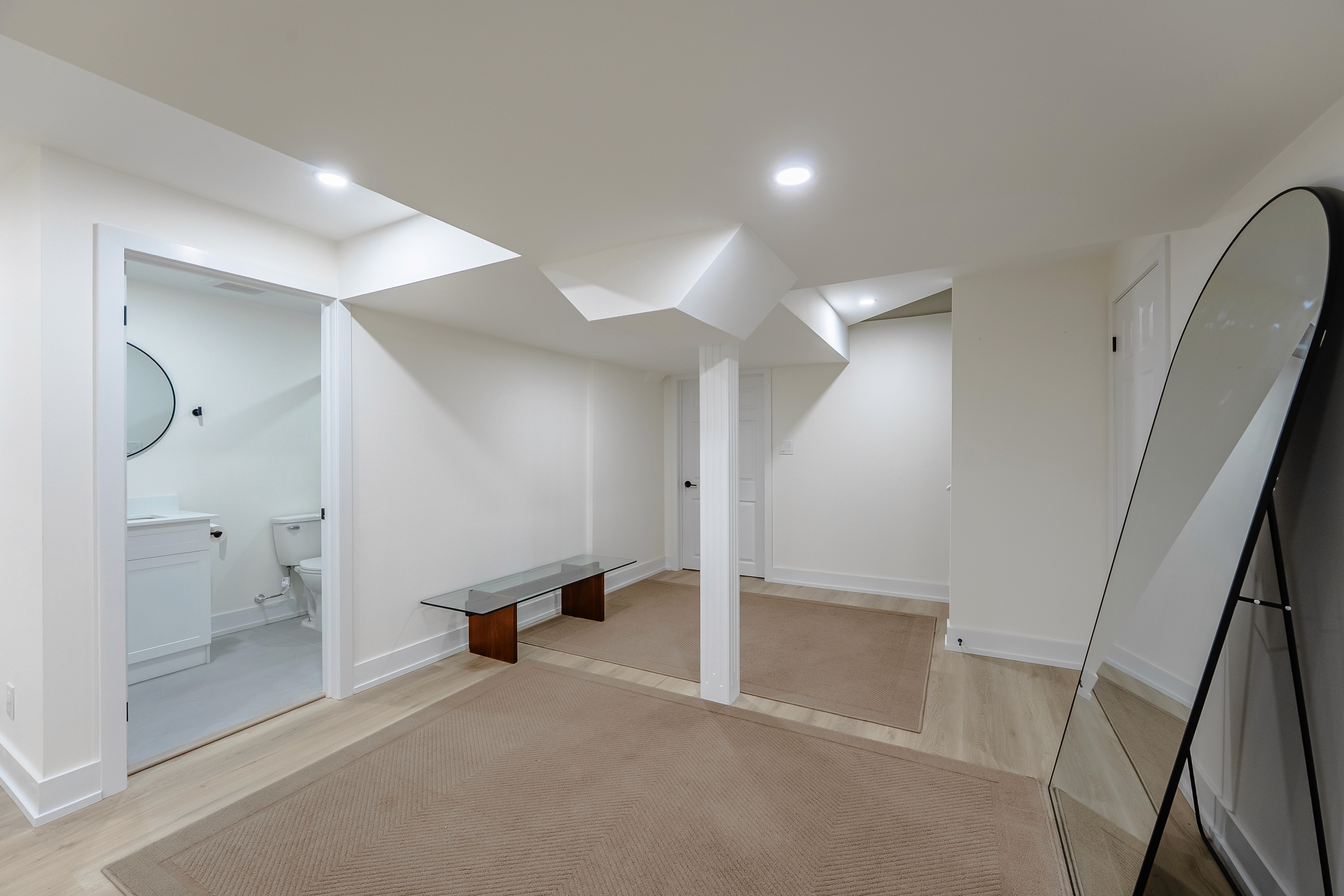 Ample recessed LED ceiling lights provide even, bright illumination throughout the suite, critical for basements with limited windows. The bathroom is also well-lit with overhead and soft mirror lighting, ensuring a consistently welcoming atmosphere in every room, day or night.