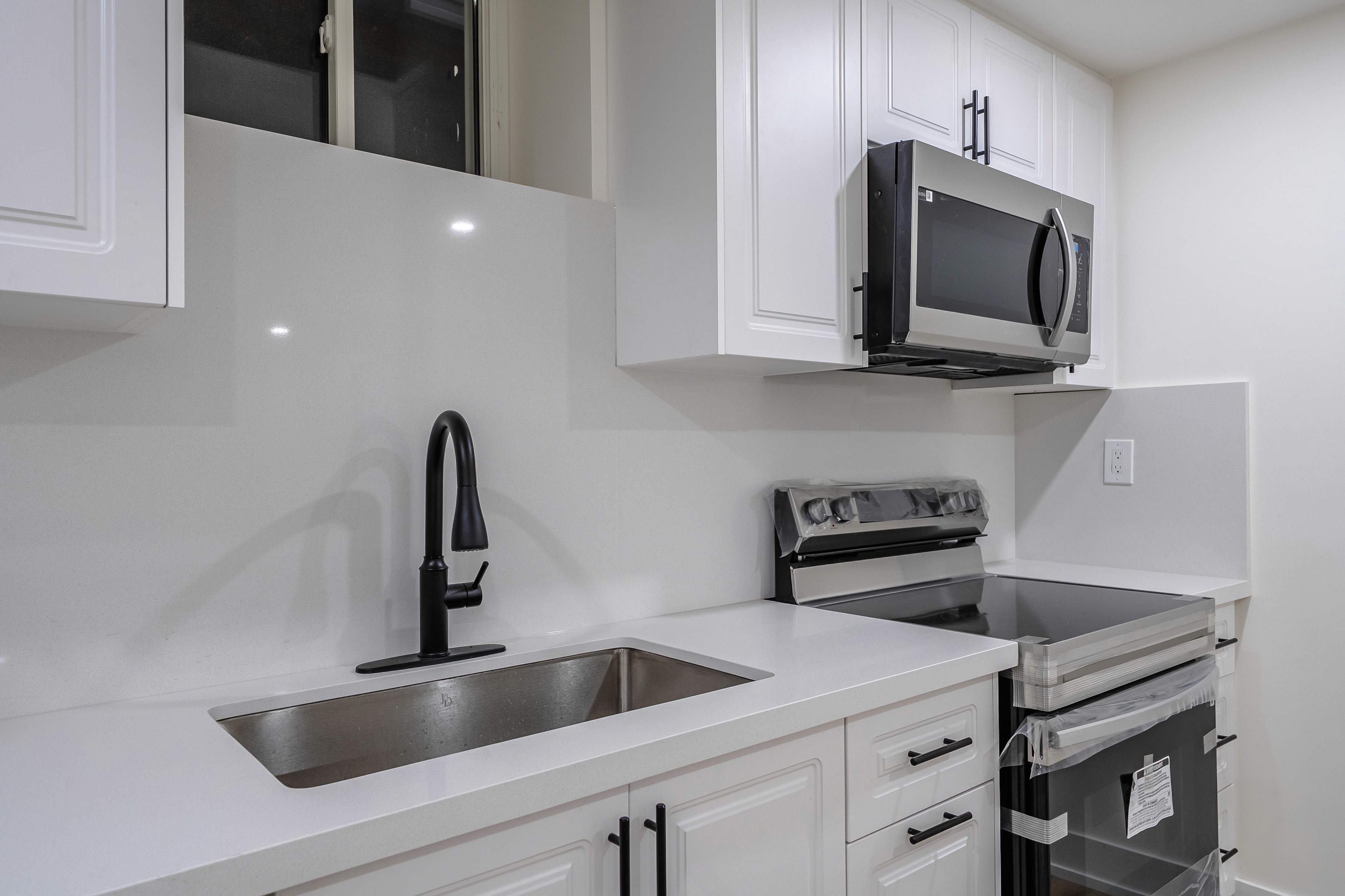 This two-bedroom basement suite is fully renovated to create a spacious, modern home with a fully equipped kitchen, airy open-plan living, and a contemporary three-piece bathroom.