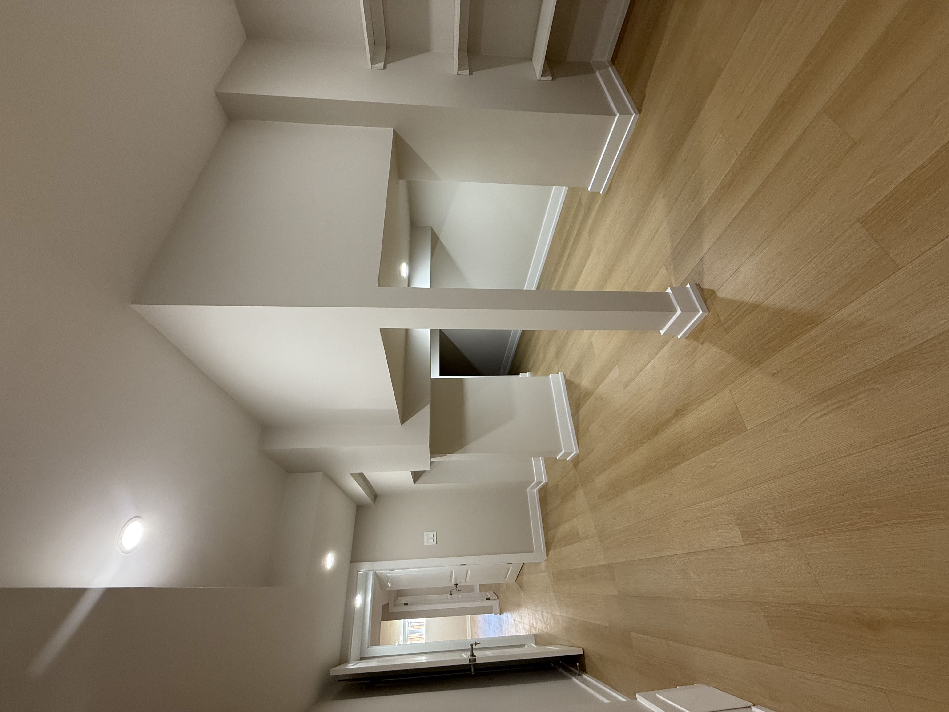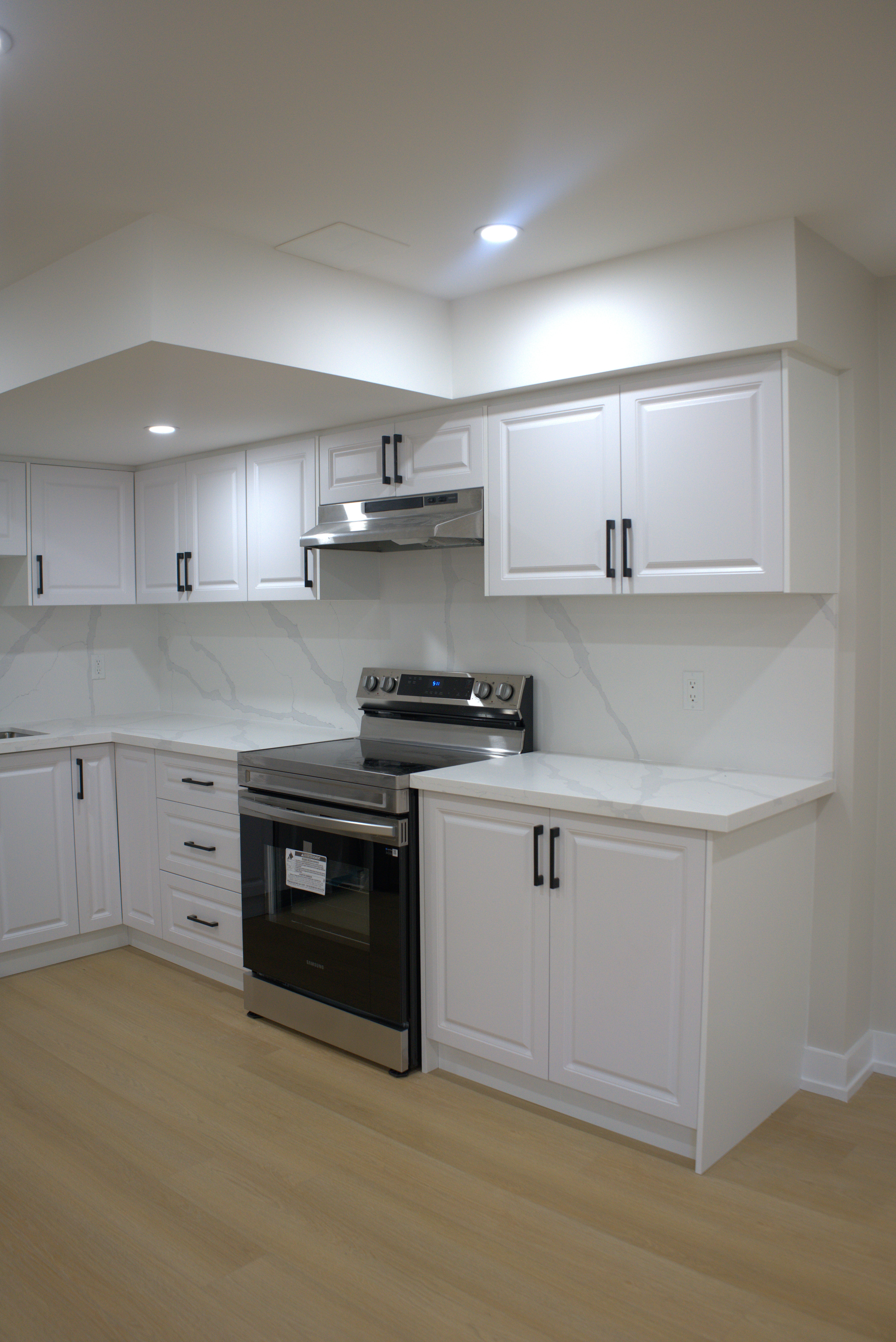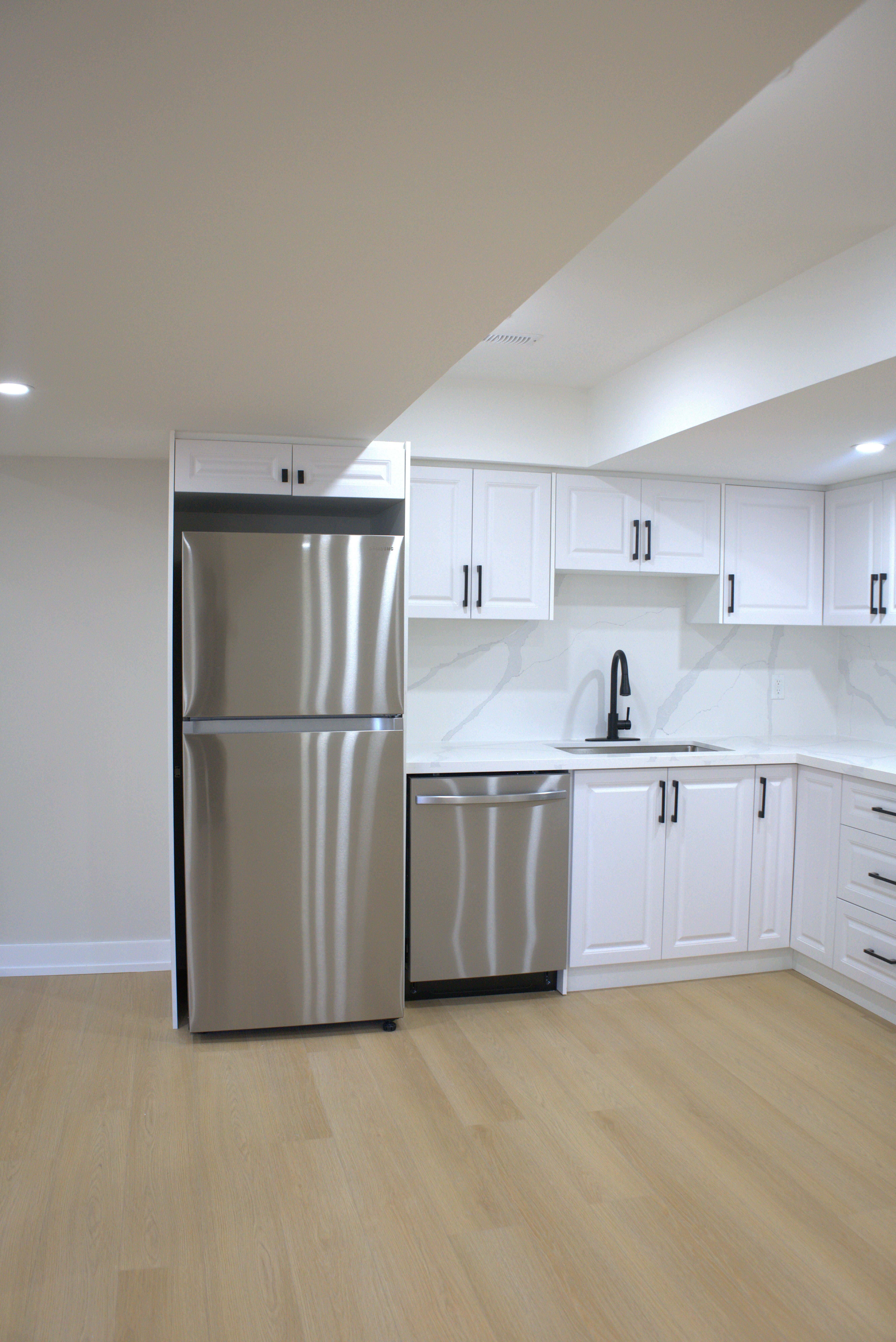 This newly renovated basement apartment embraces a contemporary minimalist aesthetic, emphasizing bright, open spaces through a neutral palette, streamlined cabinetry, and subtle modern finishes.