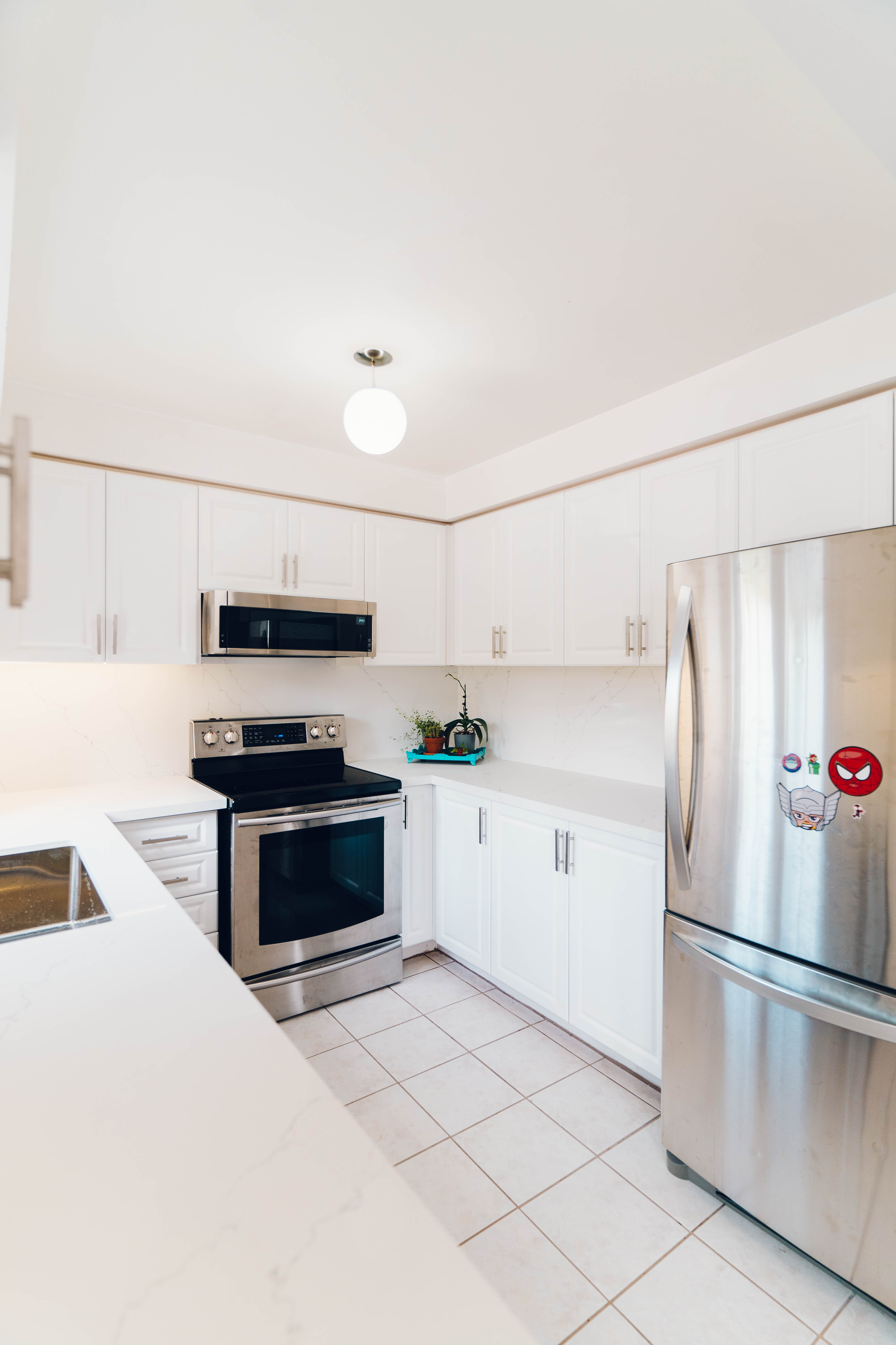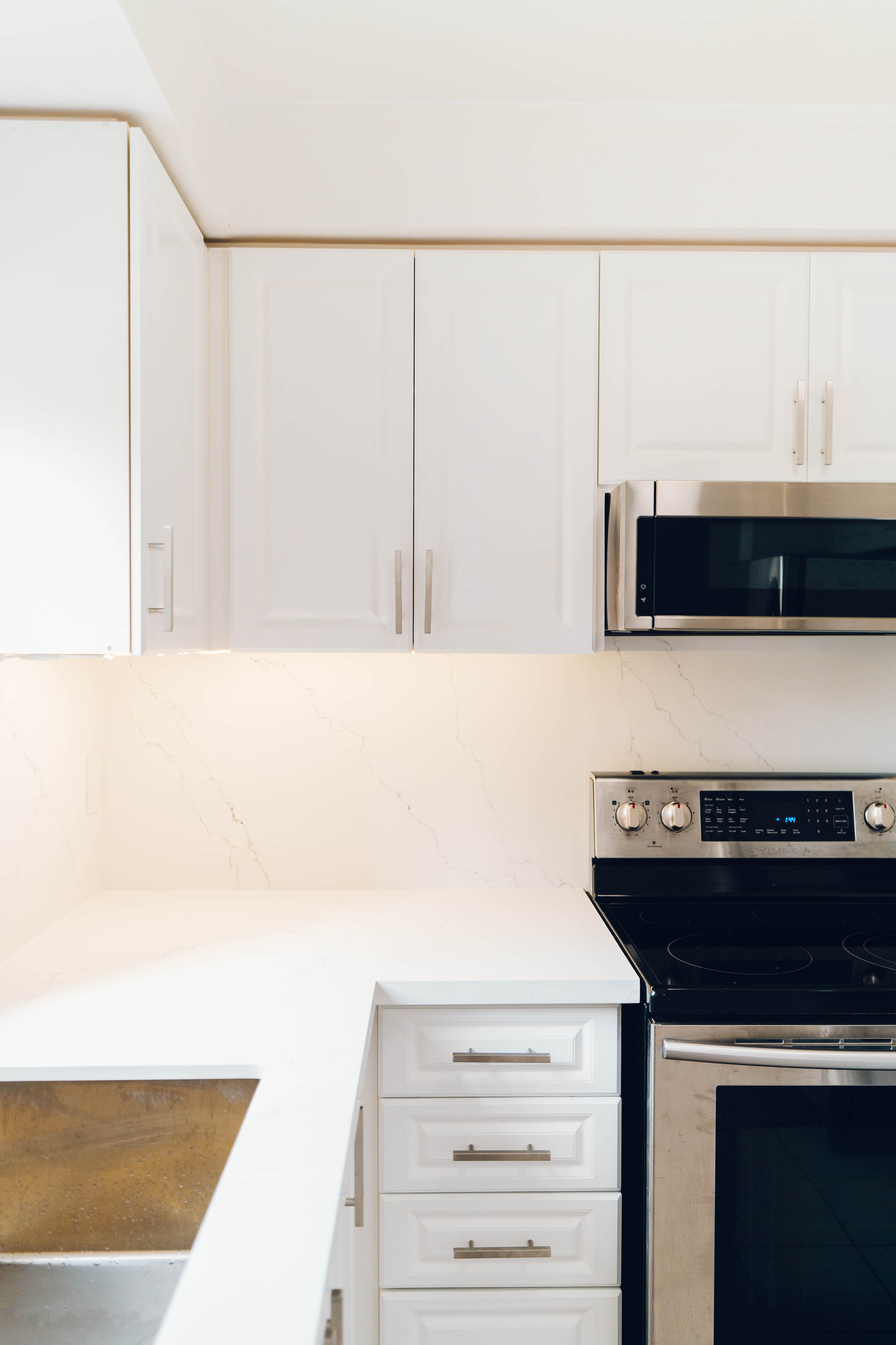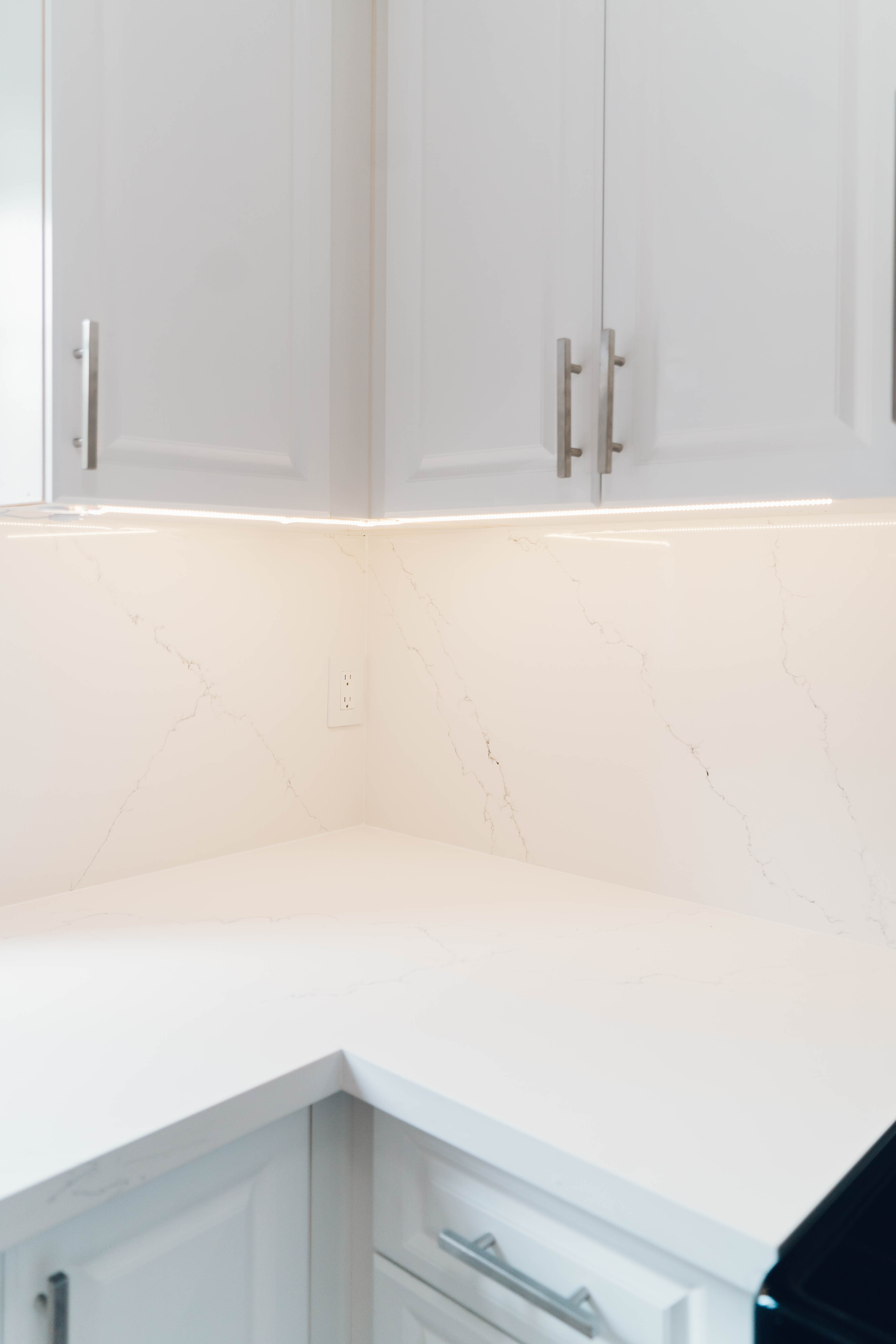 This kitchen embraces a minimalist aesthetic centered around all-white cabinetry and surfaces, highlighted by subtle veining and sleek stainless accents