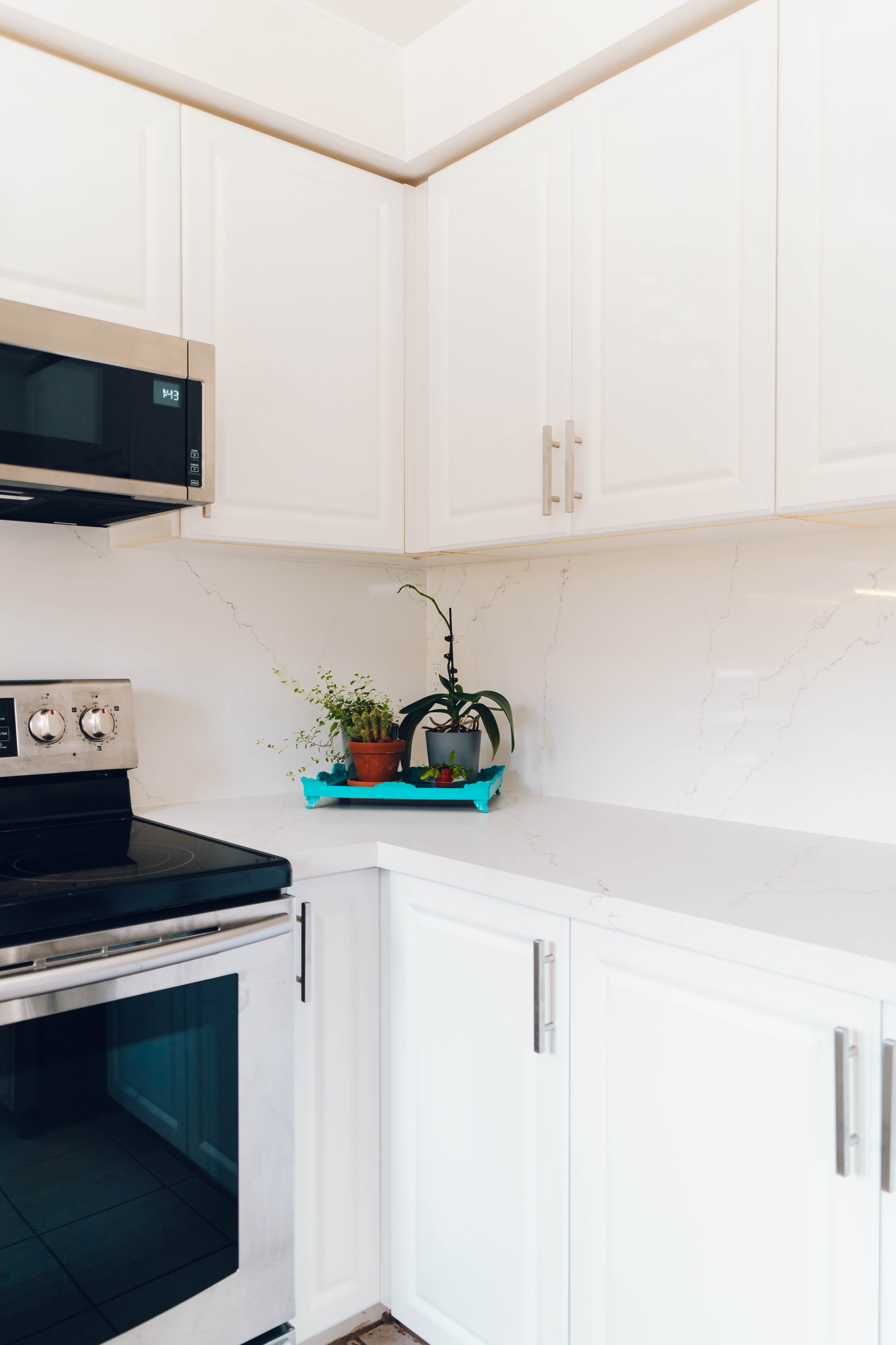 A foundation of pure white dominates cabinetry, countertops, and backsplash, complemented by light beige tiled flooring. Accents are provided by cool stainless steel, matte nickel hardware, and the faint naturals of greenery and textiles.
